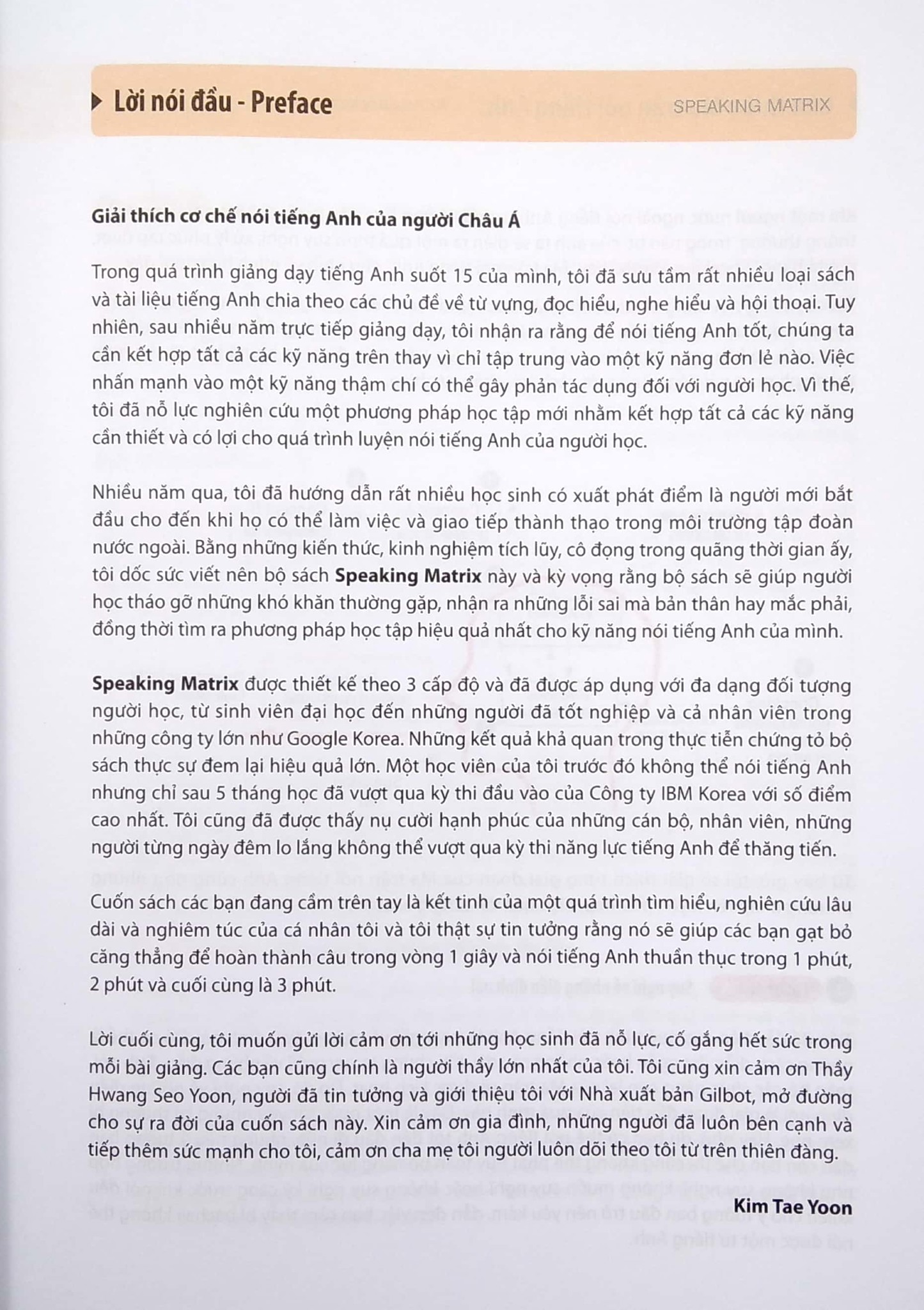 Nhiều năm qua, tôi đã hướng dẫn rất nhiều học sinh có xuất phát điểm là người mới bắt đầu cho đến khi họ có thể làm việc và giao tiếp thành thạo trong môi trường tập đoàn nước ngoài. Bằng những kiến thức, kinh nghiệm tích lũy, Cô đọng trong quãng thời gian ấy, tôi dốc sức viết nên bộ sách Speaking Matrix này và kỳ vọng rằng bộ sách sẽ giúp người học tháo gỡ những khó khăn thường gặp, nhận ra những lỗi sai mà bản thân hay mắc phải, đồng thời tìm ra phương pháp học tập hiệu quả nhất cho kỹ năng nói tiếng Anh của mình.