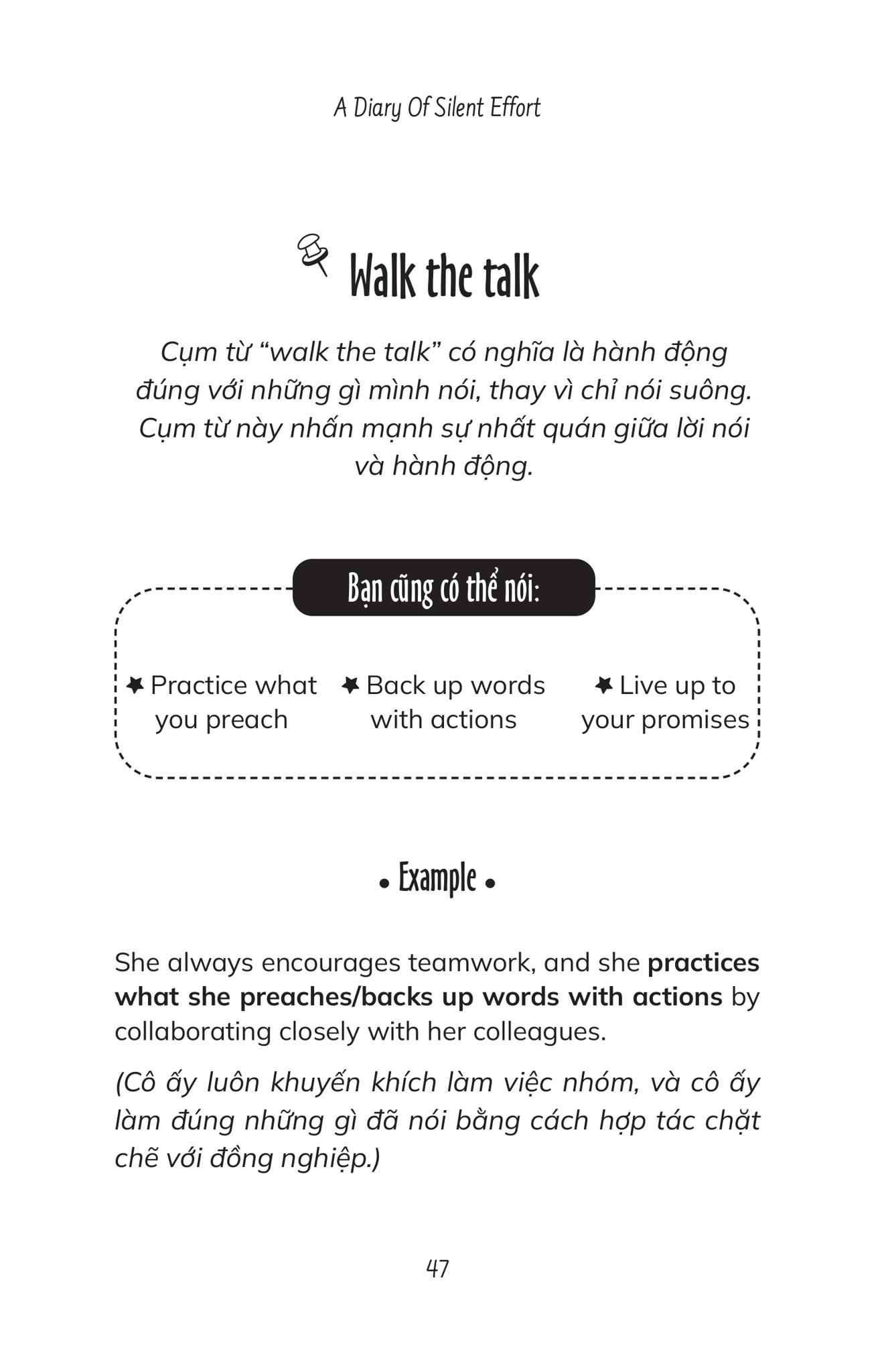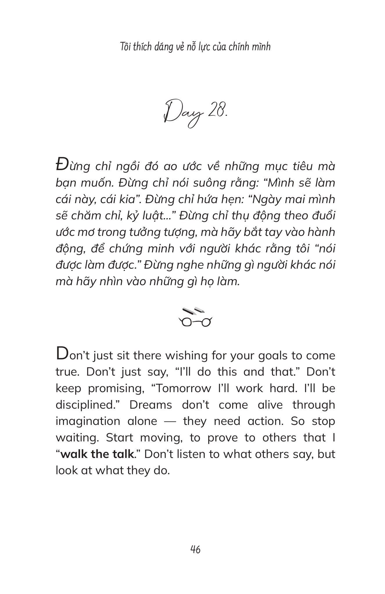 Đặc biệt với phiên bản song ngữ Việt – Anh, cuốn sách này sẽ không chỉ mang đến những thông điệp đầy cảm hứng về sự kiên trì và kỷ luật, mà còn giúp bạn rèn luyện tiếng Anh qua những trích dẫn súc tích, gần gũi. Đây sẽ là món quà hai trong một dành tặng bạn: vừa nuôi dưỡng tinh thần, vừa bồi đắp tri thức ngôn ngữ để bạn tự tin khám phá thế giới rộng lớn ngoài kia.