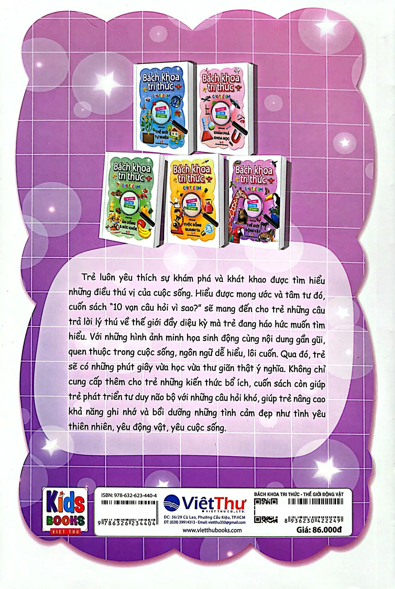 BÁCH KHOA TRI THỨC CHO TRẺ EM – 10 VẠN CÂU HỎI VÌ SAO: THẾ GIỚI ĐỘNG VẬT là cuốn sách bách khoa hấp dẫn dành cho thiếu nhi, giúp trẻ khám phá thế giới muôn loài đầy sinh động. Thông qua các câu hỏi “vì sao” quen thuộc, sách giải thích ngắn gọn, dễ hiểu về đặc điểm, tập tính, môi trường sống và khả năng đặc biệt của các loài động vật. Hình ảnh minh họa rõ ràng, sinh động giúp trẻ dễ tiếp thu và ghi nhớ kiến thức. Cuốn sách khơi gợi trí tò mò, rèn luyện tư duy khoa học và nuôi dưỡng tình yêu thiên nhiên, giúp trẻ hiểu và trân trọng thế giới động vật xung quanh.