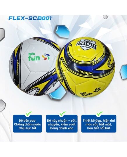 Thiết kế 3 lớp chắc chắn:Lõi butyl: Giúp giữ hơi tốt và đảm bảo bóng có độ nảy ổn định.Lớp sợi lưới chống méo: Hạn chế tối đa tình trạng bóng bị biến dạng khi va đập, giữ cho bóng luôn tròn đều.Lớp da thể thao cao cấp: Tạo cảm giác êm chân khi sút và giúp bóng bám sân tốt.Màu sắc và họa tiết hiện đại: Bóng có thiết kế bắt mắt, giúp bạn dễ dàng lựa chọn theo sở thích cá nhân.Kích thước tiêu chuẩn: Size 5, đường kính 21.5cm và trọng lượng 450g, phù hợp cho lứa tuổi từ 9-12 tuổi và các buổi tập luyện.Thông Tin Sản PhẩmTên sản phẩm: Bóng đá Flex-SCB001Kích thước: Size 5 (Đường kính 21.5cm, Trọng lượng 450g)Chất liệu: Da PVC/PUĐối tượng sử dụng: Trẻ em, thanh thiếu niên, người lớn luyện tập cường độ thấp.Hướng Dẫn Sử Dụng và Bảo QuảnKhông bơm quá căng: Bơm đúng áp suất để bóng có độ nảy tốt nhất và tránh bị méo.Tránh sử dụng trên sân ướt: Có thể làm bong lớp da bên ngoài.Không ngồi hoặc đặt vật nặng lên bóng: Gây biến dạng và làm giảm tuổi thọ của bóng.Tránh va đập mạnh vào vật sắc nhọn: Có thể làm thủng hoặc lồi bóng