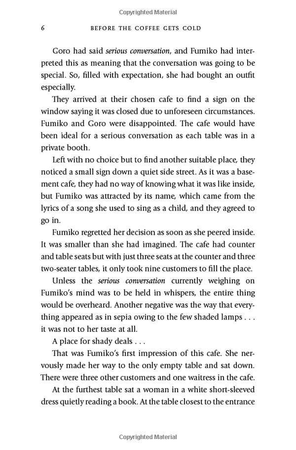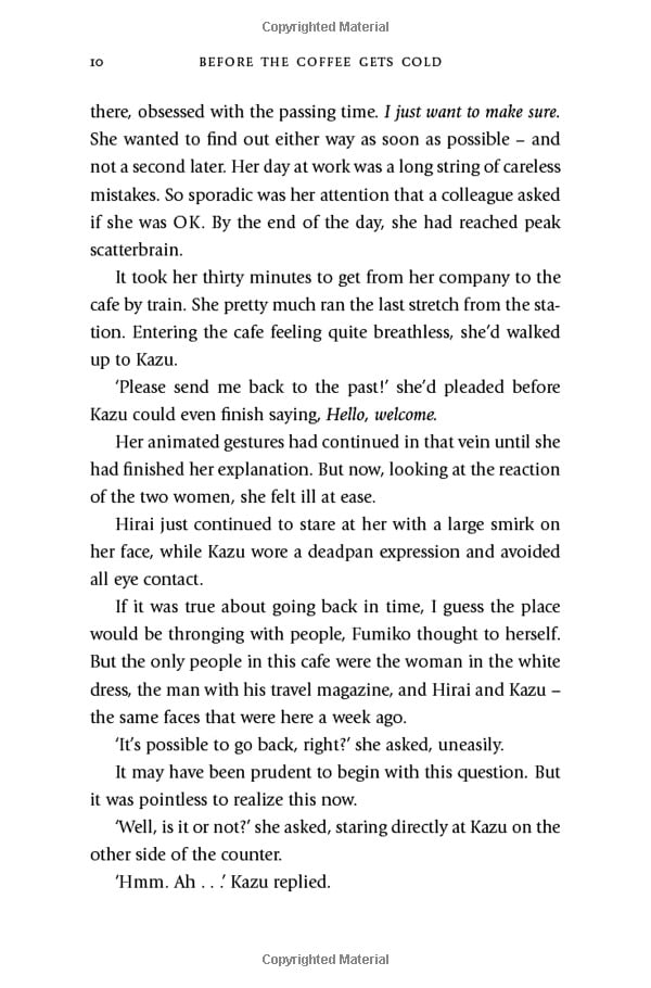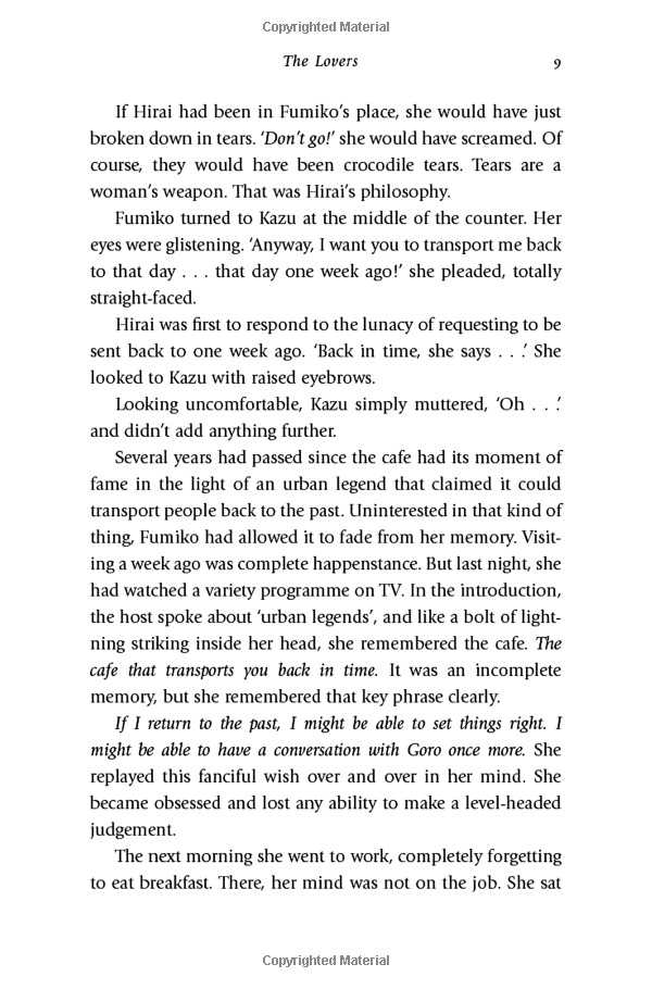 But the journey into the past does not come without risks: customers must sit in a particular seat, they cannot leave the cafe, and finally, they must return to the present before the coffee gets cold . . .