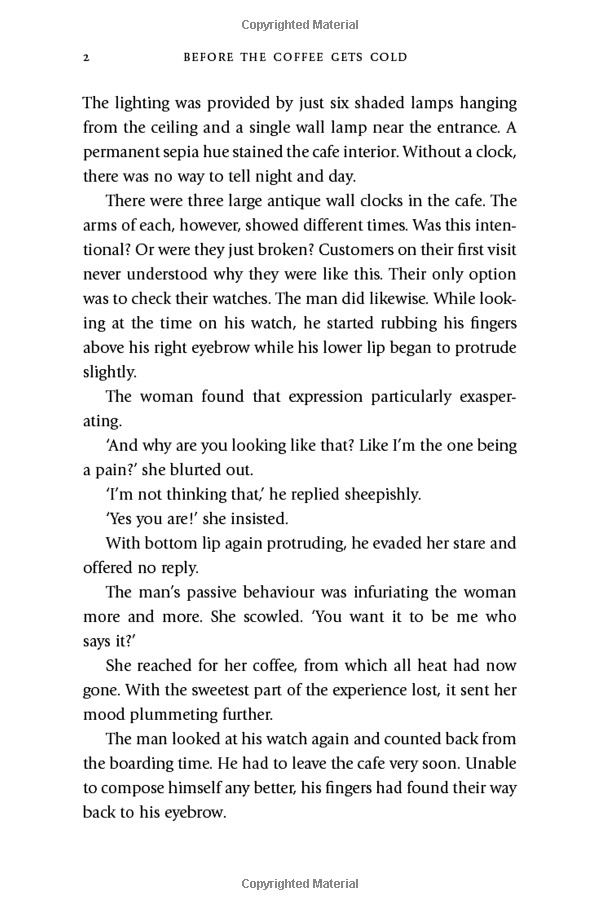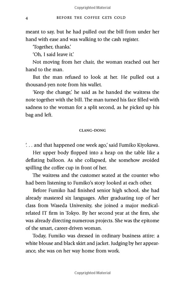 In Before the Coffee Gets Cold, we meet four visitors, each of whom is hoping to make use of the cafe's time-travelling offer, in order to: confront the man who left them, receive a letter from their husband whose memory has been taken by early onset Alzheimer's, to see their sister one last time, and to meet the daughter they never got the chance to know.
