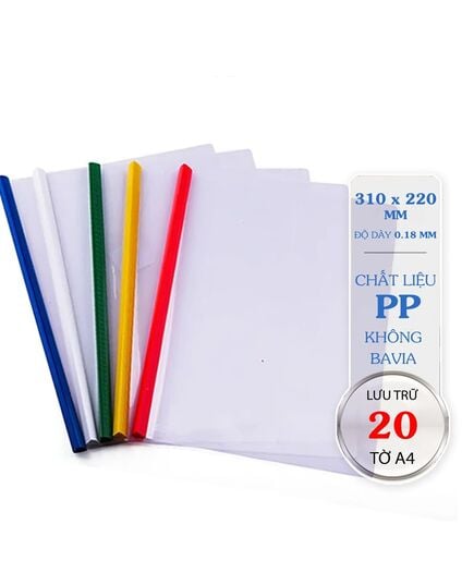 Bìa Cây 5 Màu A4 FO-RC02 Thông Số Kỹ ThuậtThương hiệu FlexofficeKích thước Dày 0.12mmTrọng lượng 24 gramQuy cách 10 Bìa/túiMàu sắc Cây nẹp có màu vàng-đỏ-hồng-xanh-camKhả năng lưu trữ 20 tờ A4Bảo quản Nhiệt độ: 10 ~ 55º C, Độ ẩm: 55 ~ 95% RH, Tránh xa nguồn nhiệt, dầu mỡ.Đặc Điểm:Người bạn không thể thiếu của sinh viên và nhân viên văn phòngĐược sản xuất theo công nghệ tiên tiến, chịu nhiệt, ít trầy xước, độ bền cao trong suốt quá trình sử dụng Sản phẩm thiết kế đẹp mắt đơn giản với nhiều lựa chọn màu sắc, vô cùng tiện lợi trong việc tìm kiếm và phân chia tài liệu Gáy kẹp chắc chắn, bền qua nhiều lần sử dụngChất liệu nhựa PP không độc hại, thân thiện với môi trườngCó 5 màu gáy tươi sáng: xanh dương, vàng, cam, hồng, đỏ