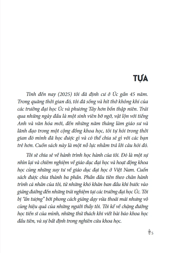 Tính đến nay (2025) tôi đã định cư ở Úc gần 45 năm. Trong quãng thời gian đó, tôi đã sống và hít thở không khí của các trường đại học Úc và phương Tây hơn bốn thập niên. Trải qua những ngày đầu là một sinh viên bỡ ngỡ, vật lộn với tiếng Anh và văn hóa mới, đến những năm tháng làm giáo sư và lãnh đạo trong một cộng đồng khoa học, tôi tự hỏi trong thời gian đó mình đã học được gì và có thể chia sẻ gì với các bạn trẻ hơn. Cuốn sách này là một nỗ lực nhằm trả lời câu hỏi đó.