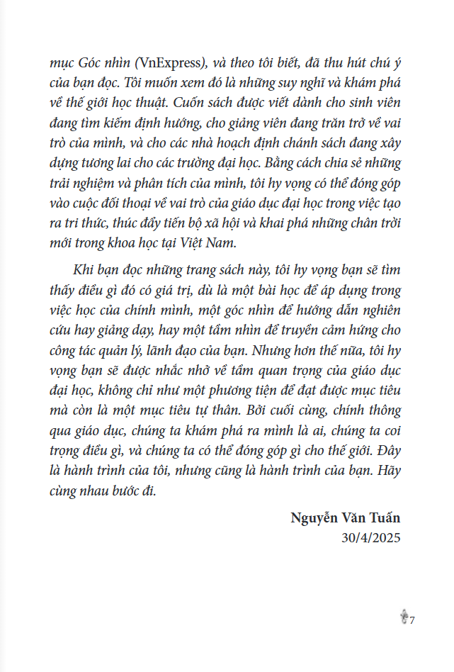 Khi bạn đọc những trang sách này, tôi hy vọng bạn sẽ tìm thấy điều gì đó có giá trị, dù là một bài học để áp dụng trong việc học của chính mình, một góc nhìn để hướng dẫn nghiên cứu hay giảng dạy, hay một tầm nhìn để truyền cảm hứng cho công tác quản lý, lãnh đạo của bạn. Nhưng hơn thế nữa, tôi hy vọng bạn sẽ được nhắc nhở về tầm quan trọng của giáo dục đại học, không chỉ như một phương tiện để đạt được mục tiêu mà còn là một mục tiêu tự thân. Bởi cuối cùng, chính thông qua giáo dục, chúng ta khám phá ra mình là ai, chúng ta coi trọng điều gì, và chúng ta có thể đóng góp gì cho thế giới. Đây là hành trình của tôi, nhưng cũng là hành trình của bạn. Hãy cùng nhau bước đi.