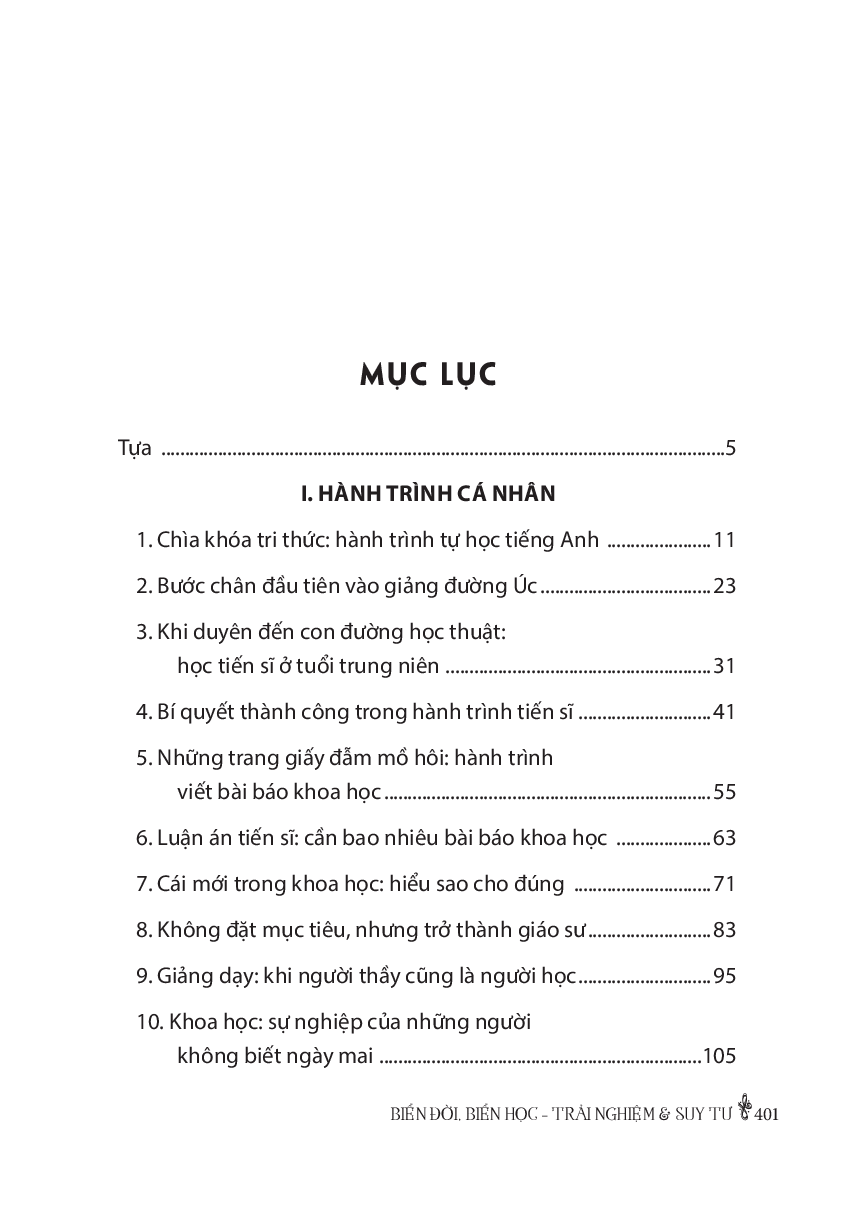 Tôi sẽ chia sẻ về hành trình học hành của tôi. Đó là một sự nhìn lại và chiêm nghiệm về giáo dục đại học và hoạt động khoa học cùng những suy tư về giáo dục đại học ở Việt Nam. Cuốn sách được chia thành ba phần. Phần đầu tiên theo chân hành trình cá nhân của tôi, từ những khó khăn ban đầu khi bước vào giảng đường đến những trải nghiệm tại các trường đại học Úc. Tôi bị “ấn tượng” bởi phong cách giảng dạy vừa thoải mái nhưng vô cùng hiệu quả của những người thầy tôi. Tôi kể về chặng đường học tiến sĩ của mình, những thử thách khi viết bài báo khoa học đầu tiên, và sự bất định trong nghiên cứu khoa học.