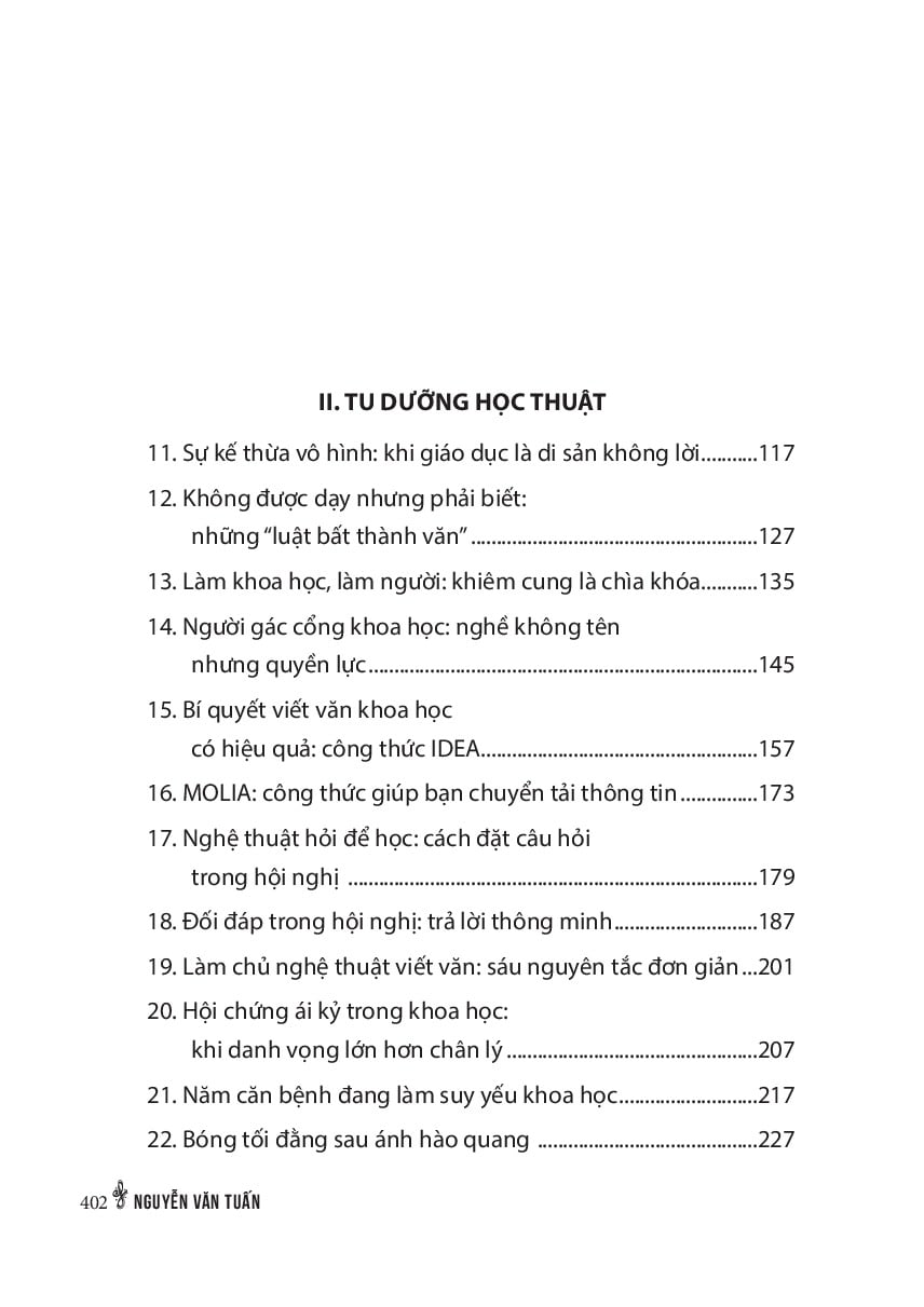 Trong phần thứ hai, tôi suy nghiệm hành trình học thuật của mình và chia sẻ những bài học và kinh nghiệm với bạn đọc. Tôi bàn về các khía cạnh quan trọng của đời sống học thuật như quy trình phản biện khoa học, kỹ năng viết bài nghiên cứu, tham gia hội nghị, và những vẫn đề đạo đức mà các nhà nghiên cứu phải đối mặt. Tôi giới thiệu các phương pháp thực tiễn, như công thức IDEA trong viết văn khoa học và phương pháp MOLIA trong báo cáo nghiên cứu. Ngoài ra, tôi cũng phân tích những vấn đề sâu xa hơn, bao gồm tâm lý học thuật, tác động của chủ nghĩa cá nhân trong khoa học, và những cạm bẫy thường gặp trong nghiên cứu.
