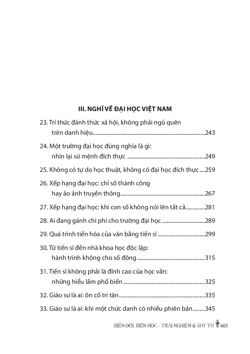 Tôi đặt ra những câu hỏi nền tảng: Sứ mệnh thực sự của một trường đại học là gì, tự do học thuật có ảnh hưởng như thế nào đến việc kiến tạo tri thức mới, xếp hạng đại học có ý nghĩa ra sao đối với Việt Nam. Tôi phân tích cấu trúc đào tạo tiến sĩ, những thách thức trong quá trình chuyển đổi từ nghiên cứu sinh thành nhà khoa học độc lập, và những hiểu lầm phổ biến về danh hiệu “giáo sư”. Phần này kết thúc bằng những để xuất cải cách trong quá trình bổ nhiệm giáo sư, nhằm đưa ra những góc nhìn về cách mà hệ thống giáo dục đại học Việt Nam có thể phát triển để đạt tiêu chuẩn quốc tế.