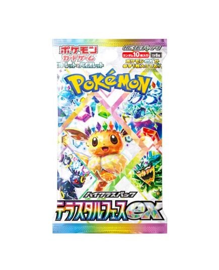 Bộ Cờ Chiến Thuật Pokemon - Bộ Cờ Mở Rộng Terastal Fes Ex SV8A PK-SV8A-J MĐThẻ bài Pokemon TCG SV8A Terastal Fes Ex Booster Pack Tiếng Nhật là lựa chọn tuyệt vời dành cho cả người mới làm quen với Pokmon TCG lẫn những nhà sưu tầm kỳ cựu. Mỗi gói Booster Pack chứa 5 thẻ bài ngẫu nhiên, mang đến cho bạn trải nghiệm thú vị, từ cảm giác háo hức khi mở gói bài đến cơ hội sở hữu những lá bài hiếm với hình vẽ minh họa cực đẹp cùng hiệu ứng lấp lánh.