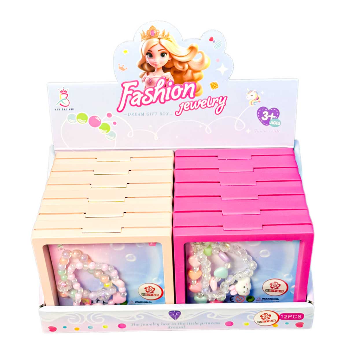 Bộ sản phẩm gồm 2 vòng tay nhựa với charm xinh xắn, được bảo quản trong hộp nhựa chắc chắn và đẹp mắt. Hình hộp 12 sản phẩm.