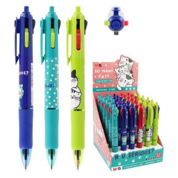 Bút bi 4 màu in hình mèo ngô nghĩnh bắt mắt. Ngòi .0.7mm, đều nét.