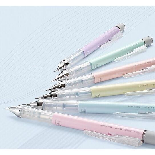 - Bút chì được thiết kế thông mình , khi cần bấm ngòi thay vì thao tác bấm thông thường bạn chỉ cần lắc nhẹ bút lên xuống , ruột chì sẽ tự động được đẩy ra theo mỗi lần lắc .