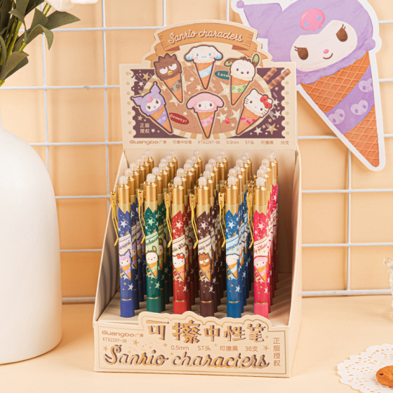 Bút gel Sanrio GUBKT82297 là loại bút mực xanh, ngòi 0,5mm có khả năng tẩy xóa được, thường được bán theo hộp 36 cây (36/H). Sản phẩm này phù hợp cho học sinh, sinh viên và những người yêu thích các nhân vật hoạt hình Sanrio như Hello Kitty, Kuromi, My Melody, v.v..