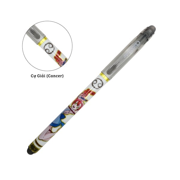 - Thân bút làm bằng nhựa nguyên sinh, phần cầm bút có lớp cao su silicon bền chắc, đảm bảo độ mềm khi viết. Thân bút được in họa tiết 12 cung hoàng đạo, hình in sắc nét, màu sắc tươi sáng.