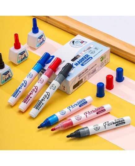 Bút Lông Bảng Đen FO-WB02 Thông số kĩ thuật :Tên danh mục Bút lông bảngThương hiệu Thiên LongBề rộng nét viết 2.5 mmSố đầu bút 1Đóng gói 10 cây/hộpTrọng lượng 10 gramMàu mực Xanh/Đỏ/ĐenĐặc điểm :- Bút được sản xuất theo công nghệ hiện đại.- Viết tốt, trơn, êm trên bảng trắng, thủy tinh và những bề mặt nhẵn bóng.- Bề rộng nét viết 2.5mm.- Sử dụng mực mới, tốt, màu mực đậm, tươi sáng, dễ dàng xóa sạch ngay cả khi viết trên bảng lâu, không để lại bóng mực sau khi lau bảng và các bề mặt nhẵn bóng.- Bơm mực dễ dàng, bao bì được thiết kế thuận tiện cho việc nhận dạng màu mực khi trưng bày.- Mực không độc hại, đạt tiêu chuẩn an toàn quốc tế.- Sợi Polyeste.- Kiểu dáng nhỏ, thon gọn phù hợp cho các em học sinh cấp 1, 2 viết trên bảng trắng.- Đầu bút ngoại nhập chất lượng cao, nét viết êm, có thể sử dụng được nhiều lần.Chức năng:- Không gây độc hại với trẻ em.- Luôn đặt bút nằm ngang và đậy nắp sau khi sử dụng.- Có thể bơm thêm mực tái sử dụng nhiều lần.