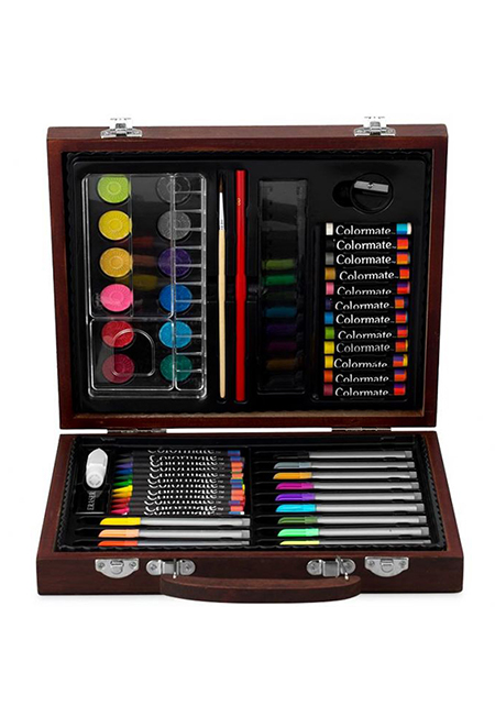 - Bộ sản phẩm bao gồm: 12 bút sáp dài, 12 bút lông, 12 bút sáp dầu, 12 bánh màu nước, 1 thước, 1 gôm, 1 cọ vẽ, 1 khay pha màu, 1 chuốt bút chì, 1 sơn trắng, 1 chì phát thảo, 1 hộp gỗ.