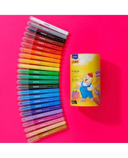 Bút Sáp Lụa SCR-C002 24 Màu Hộp 24 Bút Sáp Lụa Vặn - Colokit SCR-C002- Sản xuất đạt tiêu chuẩn theo tiêu chuẩn xuất khẩu sang Châu Âu.- Sản phẩm có thiết kế vừa tay, giúp cầm nắm và tô màu dễ dàng, dễ mang theo.- Chất liệu an toàn, có mùi thơm dễ chịu.- Màu sắc tươi sáng mịn màng trên các loại giấy, khó tẩy, lâu phai nhờ đó các tác phẩm của bé sẽ trở nên sống động và bất mắt hơn- Bút sáp lụa có mực ra đều màu, phản quang tốt giúp màu sắc tươi sáng hơn, nhờ đó các tác phẩm của bé trở nên thật sinh động, bắt mắt.
