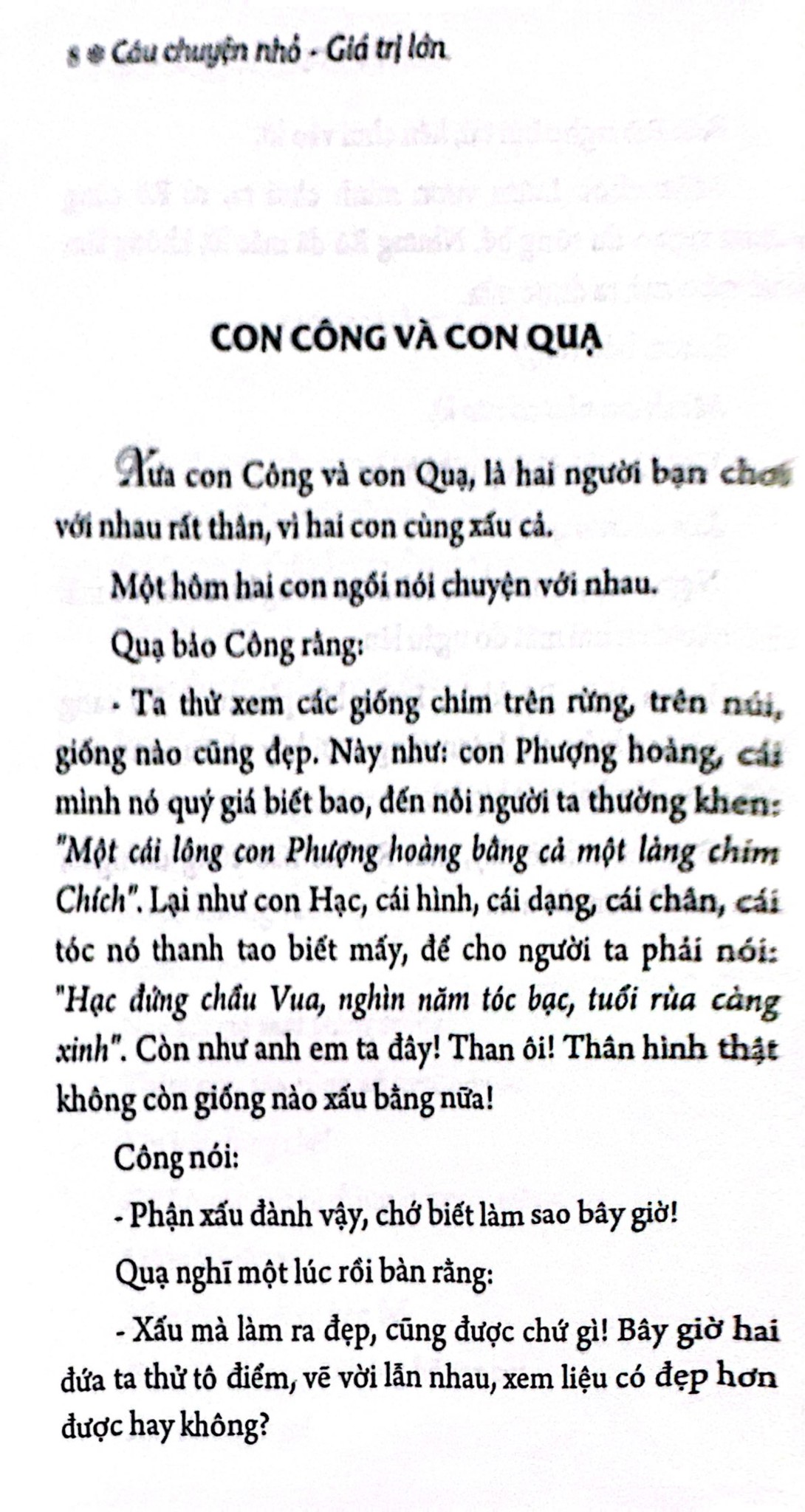 Những câu chuyện ngụ ngôn, truyện cổ tích chứa đựng những bài học đạo đức quý giá nuôi dưỡng tâm hồn các em thiếu nhi từ đó hình thành nhân cách tốt cho các em ngay từ nhỏ. Ngoài ra cuốn sách còn là món quà tinh thần cho tất cả những ai yêu thích truyện ngụ ngôn, truyện cổ tích.