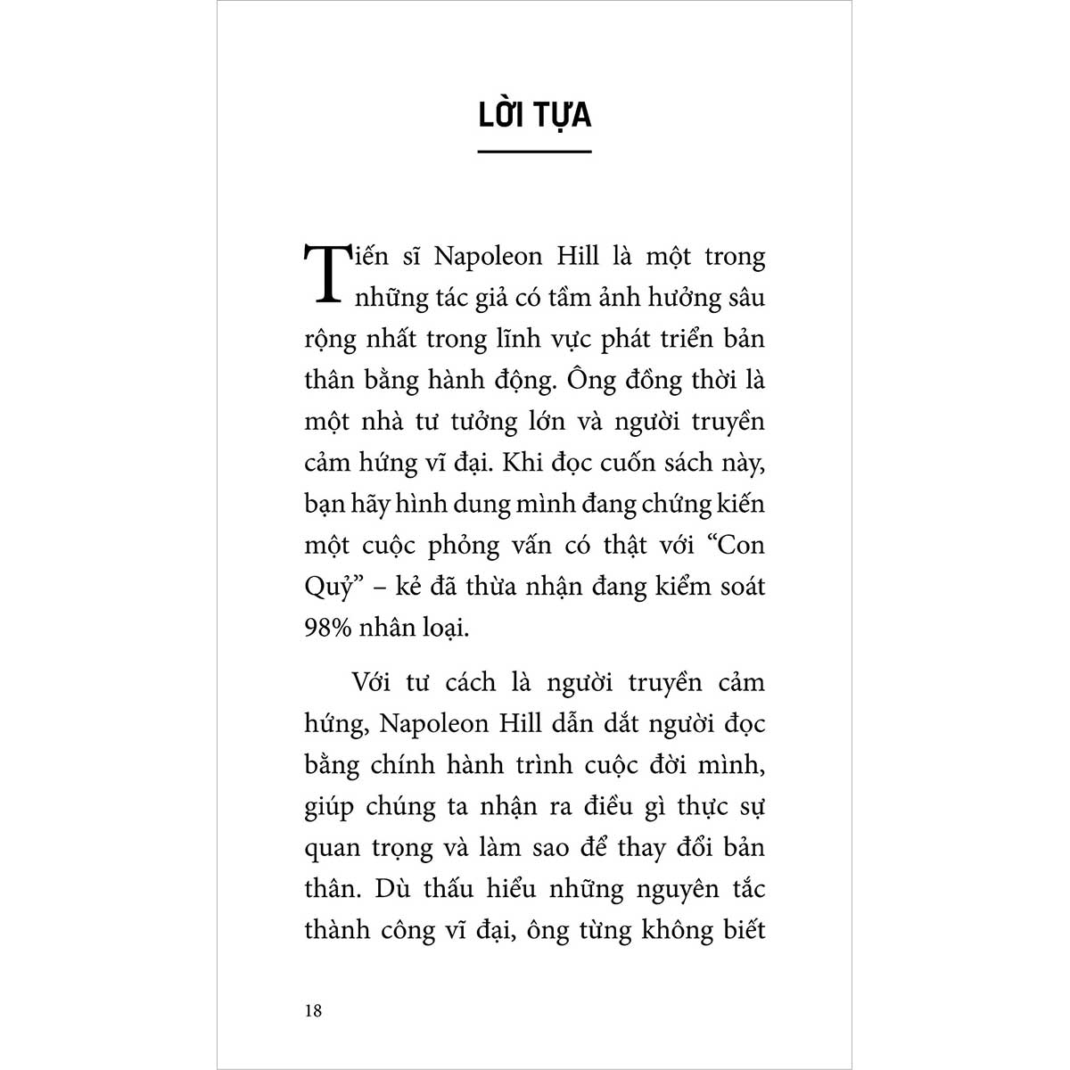 Cuốn sách nhấn mạnh tầm quan trọng của kỷ luật bản thân, suy nghĩ tích cực, kiểm soát cảm xúc và kiên định với mục tiêu. Hill cho rằng chỉ khi con người vượt qua nỗi sợ, làm chủ được chính mình và hành động có ý thức, họ mới có thể thoát khỏi sự kiểm soát của “con quỷ” và đạt được thành công bền vững. Đây là lời cảnh tỉnh mạnh mẽ và sâu sắc về sức mạnh của tư duy độc lập.