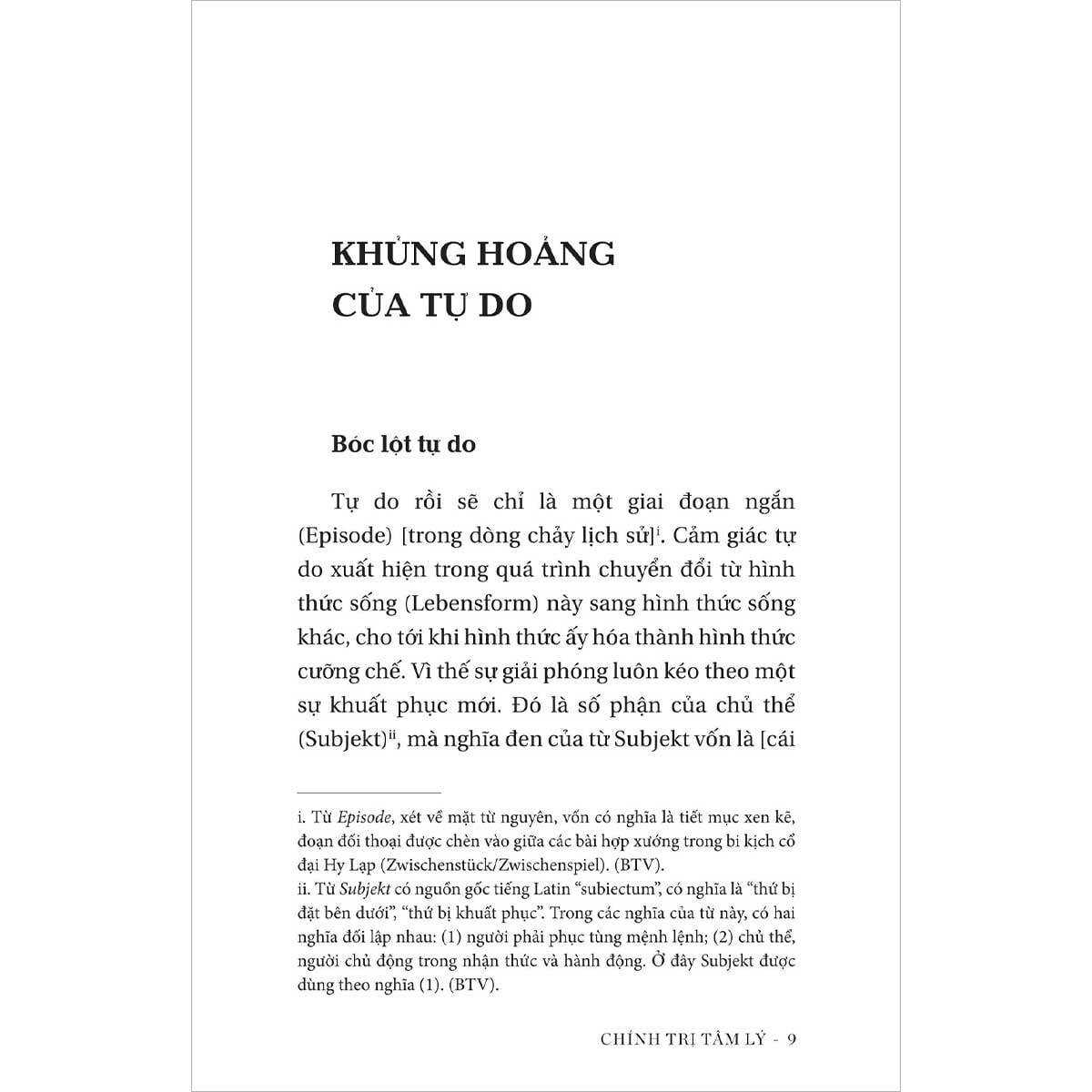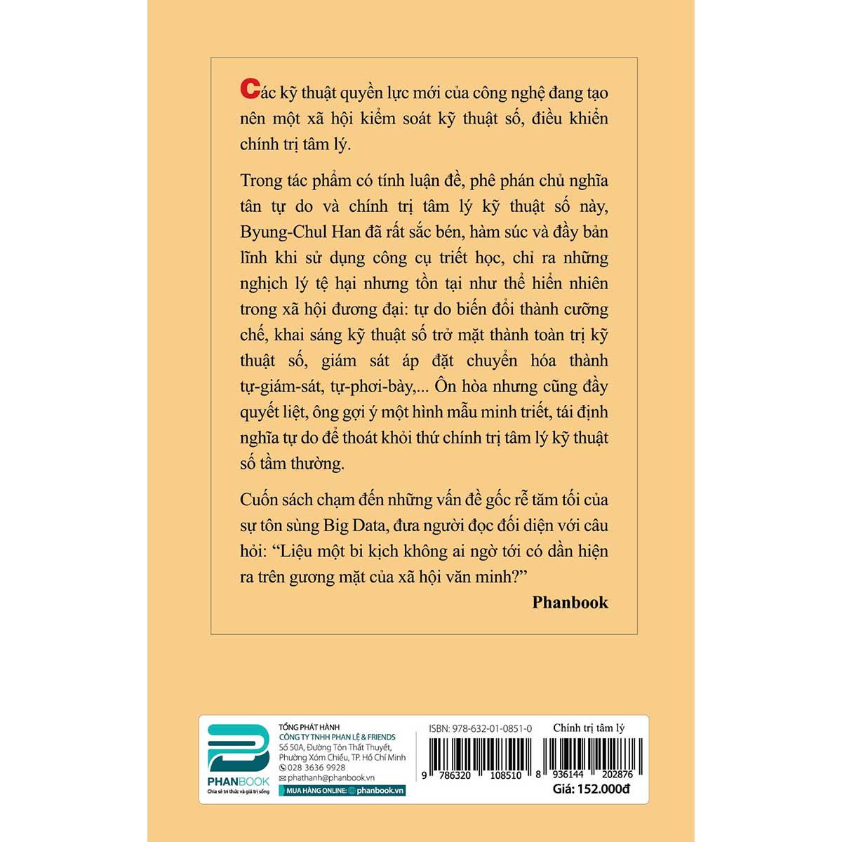 Trong Chính trị tâm lý, cuốn sách thứ hai của triết gia Byung-Chul Han giới thiệu tại Việt Nam (sau cuốn Sự biến mất của nghi thức), độc giả được soi tỏ về một mối nguy cơ hiện hữu trong thời đại mình: Chúng ta đang bị thao túng, và tệ hơn, tự biến mình thành kẻ bị thao túng. Với lối dẫn dắt dễ hiểu, hàm súc mà vô cùng sâu sắc, Byung-Chul Han soi rọi những nghịch lý nhưng tồn tại như thể hiển nhiên trong xã hội đương đại: tự do biến đổi thành cưỡng chế, khai sáng kỹ thuật số trở thành toàn trị kỹ thuật số, giám sát áp đặt chuyển hóa thành tự-giám-sát, tự-phơi-bày…