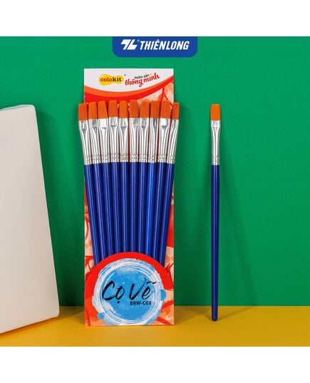 Cọ Vẽ BRW-C03Thông số kĩ thuật :Thương hiệu ColokitQuy cách 10 cây / kiện.Loại cọ Phẳng số 4Tiêu chuẩn TCCS 0104:2018/TL-COVEKhuyến cáo Tránh nguồn nhiệt, hóa chất. Không thích hợp cho trẻ dưới 3 tuổi.Không dùng cho sơn màu, sơn dầu và mực tàu.Đặc điểm sản phẩm:- Cọ vẽ BRW-C03 dùng để vẽ màu nước, màu Acrylic.- Có phủ keo gia cố lông cọ.