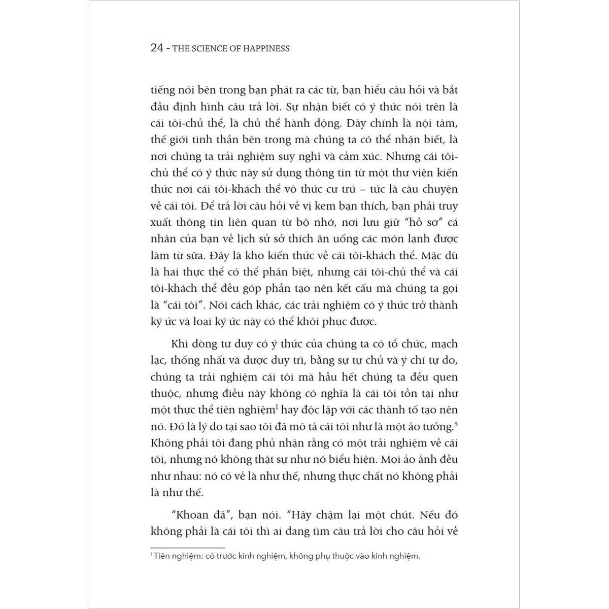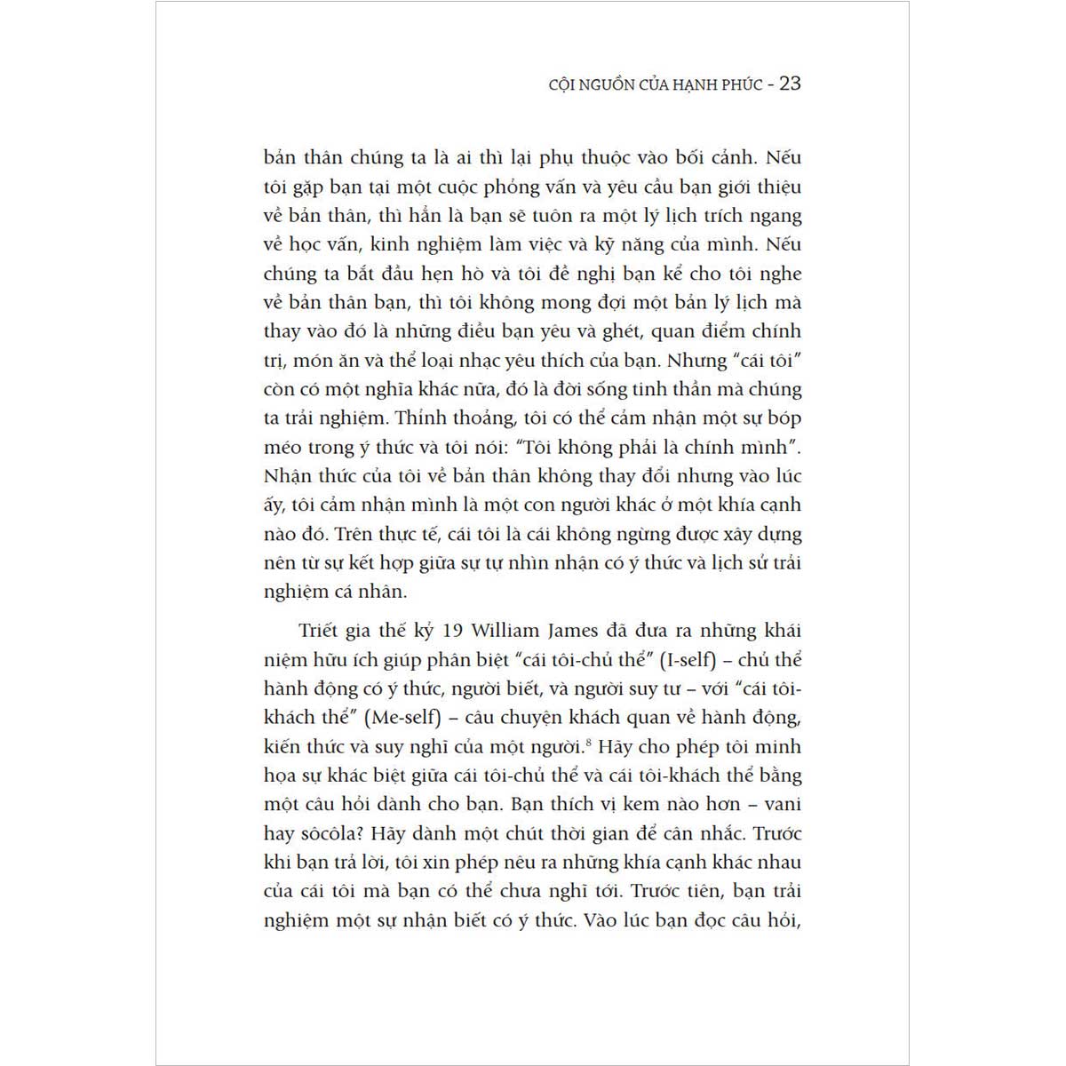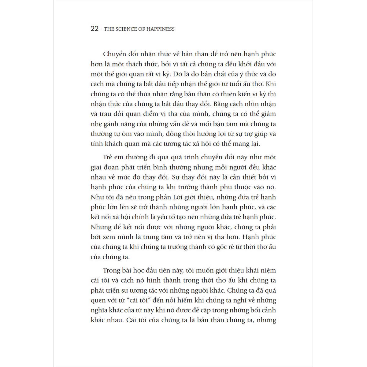 Vì lẽ đó, “Cội nguồn của hạnh phúc” không phải là một cuốn sách “tu dưỡng cái tôi”. Thậm chí, ở nhiều phương diện, nó khiến bạn nhận thấy sự cần thiết phải “tiêu hủy cái tôi”. Bởi cái tôi quá vị kỷ có thể là điều ngăn trở chúng ta hạnh phúc. Tuy nhiên, chúng ta cũng không nên cố gắng loại bỏ ý thức về cái tôi bằng cách trở nên hoàn toàn vị tha. Nếu chỉ nghĩ và cảm thông cho người khác, chúng ta có nguy cơ đánh mất hoàn toàn ý niệm về bản thân, và điều này cũng quan trọng đối với sức khỏe tâm thần của chúng ta không kém sự kết nối với người khác.