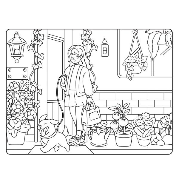 Cozy Healing - Nắng Xuân Qua Góc Phố thuộc dòng Cozy Healing – một “trạm dừng bình yên” dành cho những ai muốn tạm rời màn hình để quay về với giấy, bút màu và những khung cảnh dễ thương. Một buổi chiều nắng xuân dịu nhẹ bên góc phố bakery, cô gái dắt mèo cưng đi dạo giữa sắc hoa và mùi bánh ngọt – khung cảnh healing lý tưởng để tô màu, thư giãn và nuôi dưỡng cảm xúc tích cực.