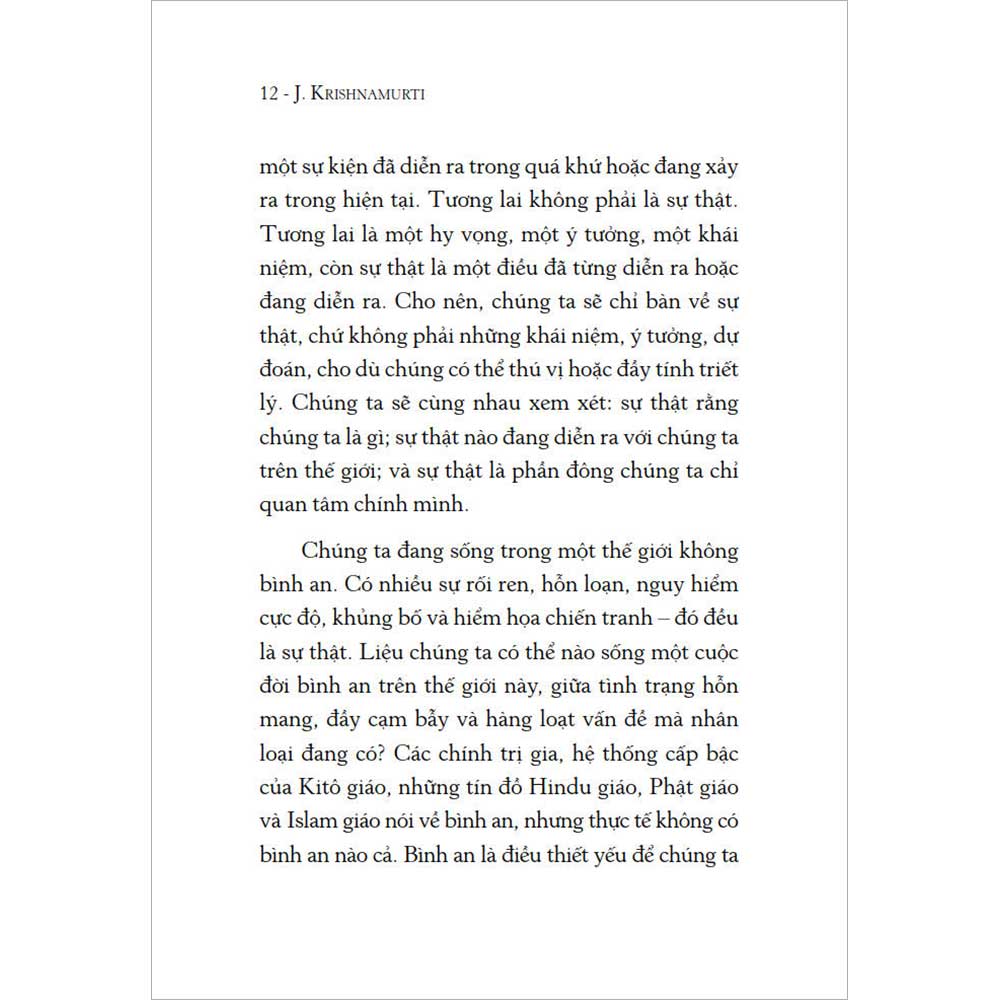 Đã hơn 40 năm kể từ khi Krishnamurti trình bày các bài nói chuyện kể trên, nhưng giá trị và tính thời sự của chúng hầu như vẫn còn vẹn nguyên. Hãy nghe ông nói: “Ngay lúc này, những cuộc chiến tranh vẫn đang diễn ra trên thế giới, giết nhau vì những lý tưởng và những ý tưởng, để khẳng định vị thế và quyền lực của quốc gia, để lãnh thổ không bị xâm phạm hoặc bị bao vây. Hành động đó có thông tuệ chăng? Loài người đã tiến hóa qua một quãng thời gian dài, đã có hai cuộc chiến tranh thế giới kinh hoàng, ấy vậy mà họ vẫn đang chuẩn bị cho một cuộc chiến khác”.