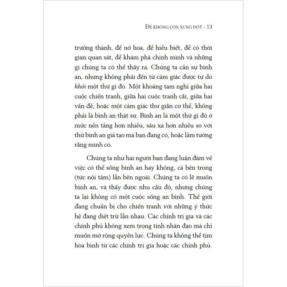 “Để không còn xung đột” (Can conflict end) được chia thành hai phần: phần một là chuỗi sáu bài nói chuyện trước công chúng và phần hai là hỏi đáp. Qua từng bài nói chuyện, Krishnamurti lần lượt khám phá từng vấn đề một: từ bản chất của bộ não, đến cái tôi luôn tìm kiếm sự an toàn trong ảo tưởng, toàn thể loài người đang đứng trên cái nền chung, căn nguyên của xung đột và làm sao để chấm dứt xung đột.