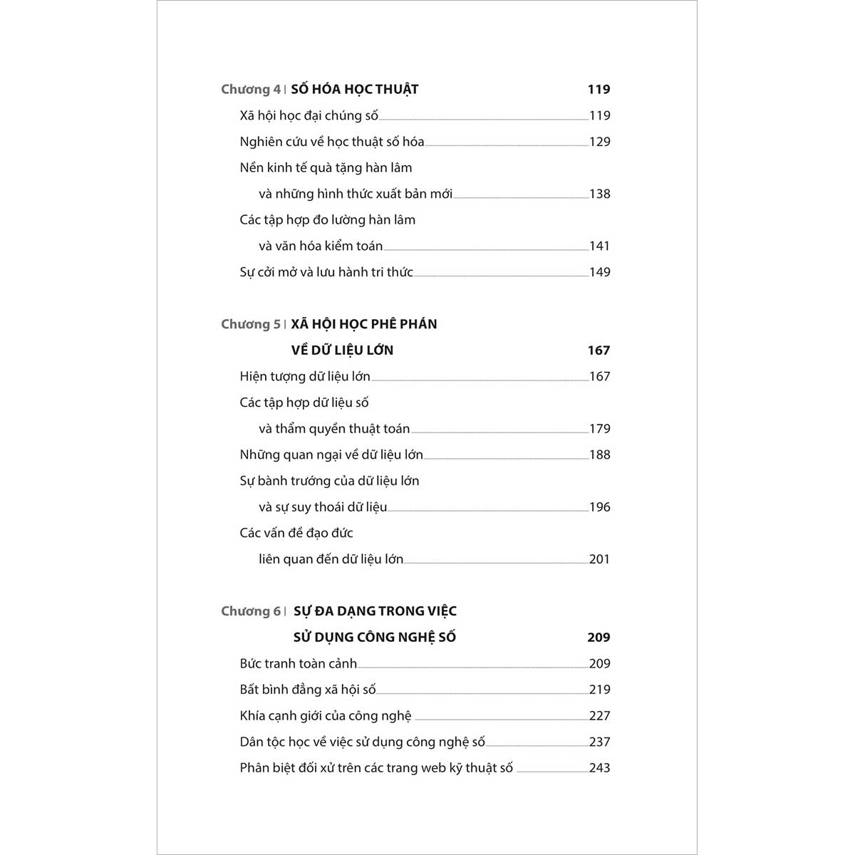 Cuốn sách xây dựng một khung lý thuyết xã hội học số mới mẻ qua bốn hướng tiếp cận: từ việc ứng dụng công cụ kỹ thuật số trong nghiên cứu xã hội học, phân tích ảnh hưởng của công nghệ lên tương tác xã hội, phương pháp khai thác dữ liệu số, đến cách nhìn phản biện về bản chất công nghệ.