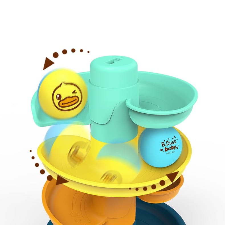 - Bé thả bóng lăn cầu trượt từ trên đỉnh tháp xuống, lặp lại nhiều lần để kết hợp vận động giữa tay và mắt cùng âm thanh vui nhộn.