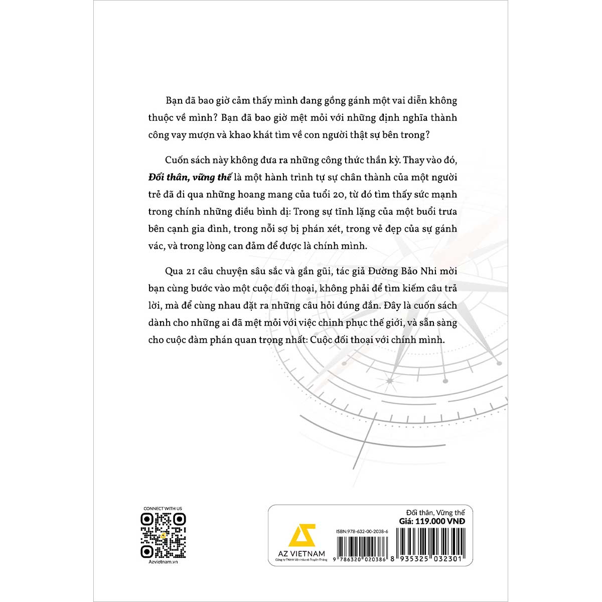 Không đưa ra những công thức thần kỳ, cuốn sách Đối thân, Vững thế - Thấu suốt bên trong, vững vàng giữa bão giông là hành trình tự sự chân thành của một người trẻ đã đi qua những chao đảo ở tuổi 20, và tìm thấy sức mạnh từ chính những điều bình dị, nhỏ bé trong cuộc sống. Qua 21 câu chuyện gần gũi và sâu sắc, tác giả Đường Bảo Nhi mời bạn bước vào một cuộc đối thoại - không phải để tìm kiếm câu trả lời, mà để cùng nhau đặt ra những câu hỏi đúng đắn, để hiểu được điều bản thân thật sự muốn là gì.