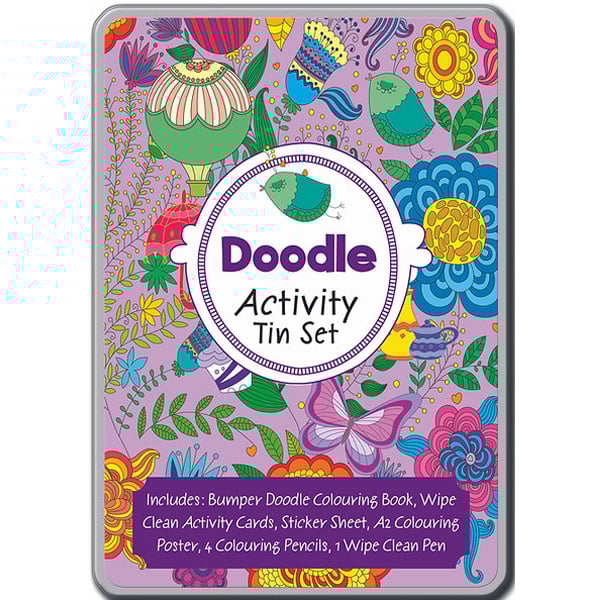 This fantastic activity tin set includes a beautifully illustrated doodlling book, a collection of wipe clean cards, sticker sheets, colouring pencils, an A2 colouring poster, and a magic marker with an eraser.