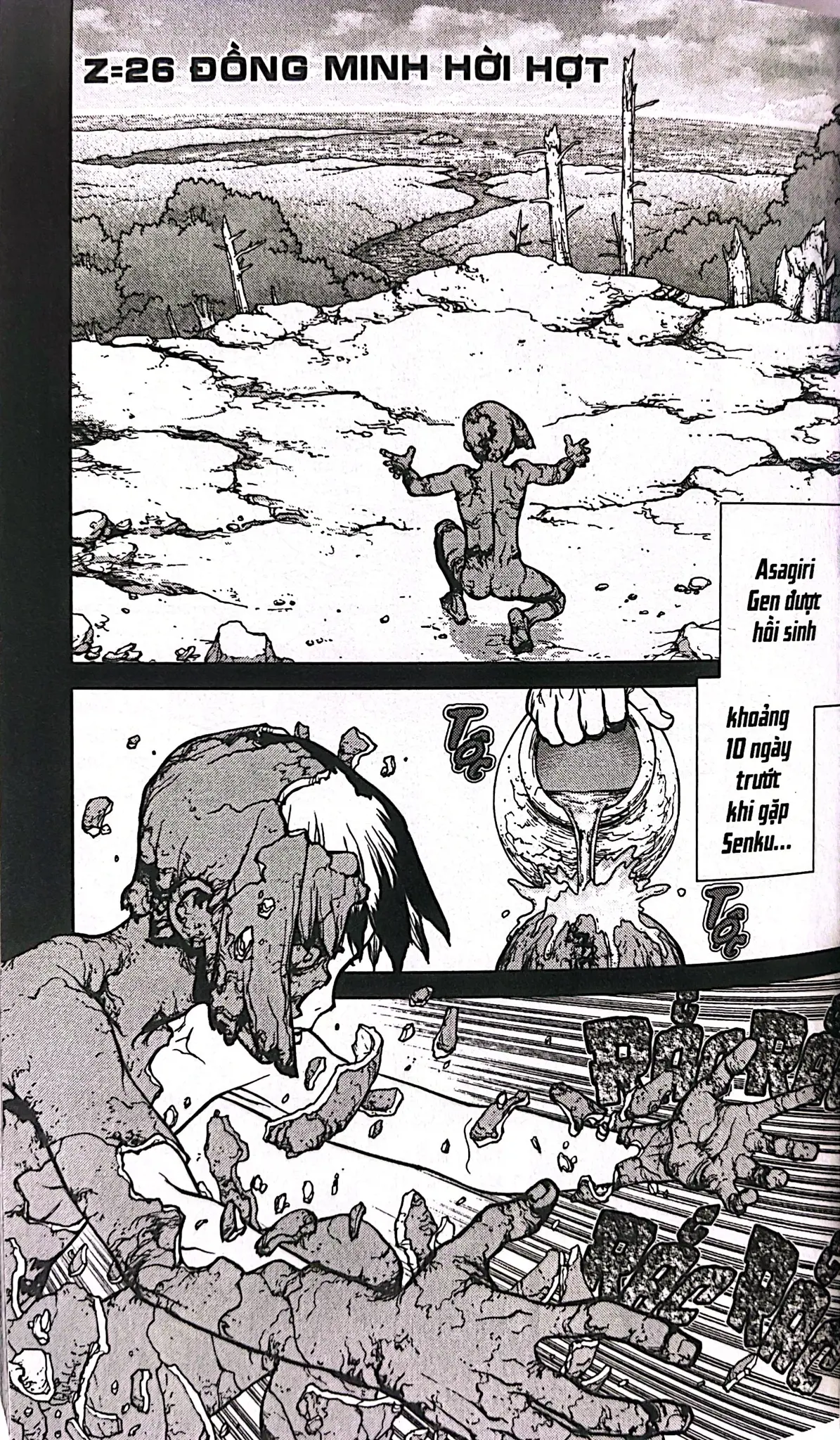 Senku cùng đồng đội thẳng tiến trên bản đồ lộ trình khoa học để điều chế sulfonamide - thần dược trị bách bệnh. Để lấy được axit sunfuric, chất khó kiếm nhất, họ quyết định liều mạng dấn thân vào vùng đất tử thần. Mặt khác, trong làng, cuộc tỉ thí võ thuật giành chức trưởng làng đang đến gần…!?