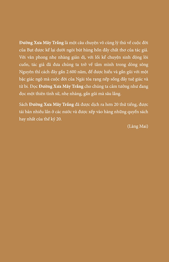Đường Xưa Mây Trắng - Theo Gót Chân Bụt là một câu chuyện vô cùng lý thú về cuộc đời của Bụt được kể lại dưới ngòi bút hùng hồn đầy chất thơ của tác giả. Với văn phong nhẹ nhàng giản dị, với lối kể chuyện sinh động lôi cuốn, tác giả đã đưa chúng ta trở về tắm mình trong dòng sông Nguyên thỉ cách đây gần 2.600 năm, để được hiểu và gần gũi với một bậc giác ngộ mà cuộc đời của Ngài tỏa rạng nếp sống đầy tuệ giác và từ bi. Đọc Đường Xưa Mây Trắng cho chúng ta cảm tưởng như đang đọc một thiên tình sử, nhẹ nhàng, gần gũi mà sâu lắng.