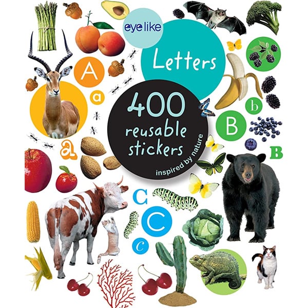 They're reusable! The sticker book series that kids love has a new addition: EyeLike Stickers: Letters. The book contains 400 full-color stickers that are amazingly detailed and lifelike in quality and are designed to be stuck on, peeled off, and stuck on again without tearing or losing their "stick." The books' inside covers are glossy illustrated backgrounds on which kids can create lively and original
