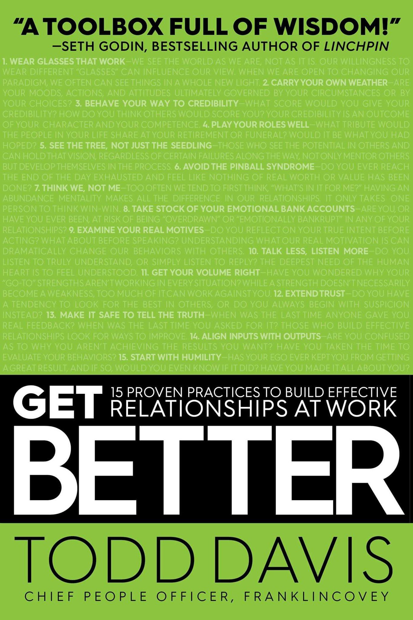 In Get Better: 15 Proven Practices to Build Effective Relationships, FranklinCovey's Chief People Officer Todd Davis explains that an organization's greatest asset isn't its people; rather, it's the relationships between its people that is the greatest predictor of personal effectiveness. In the end, employees' ability to build and sustain great relationships is an organization's ultimate competitive advantage.