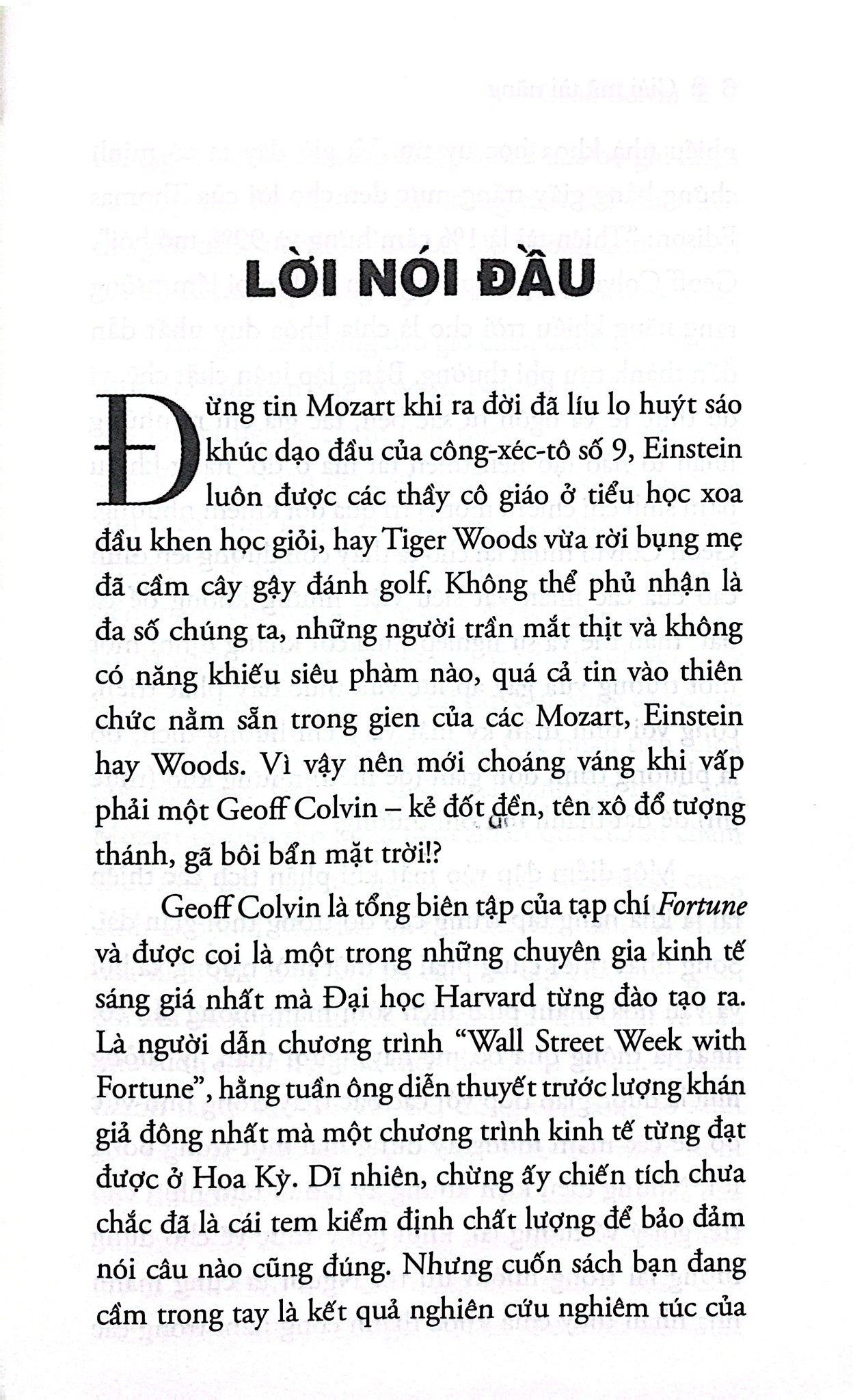 Không thể phủ nhận là đa số chúng ta, những người trần mắt thịt và không có năng khiếu siêu phàm nào, quá dễ tin vào thiên chức nằm sẵn trong gien của các Mozart, Einstein hay Woods. Vì vậy nên mới choáng váng khi vấp phải một Geoff Colvin – kẻ đốt đền, tên xô đổ tượng thánh, gã bôi bẩn mặt trời!? Geoff Colvin là tổng biên tập của tạp chí “Fortune Magazine“ và được coi là một trong những chuyên gia kinh tế sáng giá nhất mà ĐH Harvard từng đào tạo ra. Là người dẫn chương trình “Wall Street Week with Fortune“, hằng tuần ông diễn thuyết trước số khán giả đông nhất mà một chương trình kinh tế từng đạt được ở Hoa Kỳ. Dĩ nhiên, chừng ấy chiến tích không nhất thiết là cái tem chất lượng để bảo đảm nói câu nào cũng đúng.