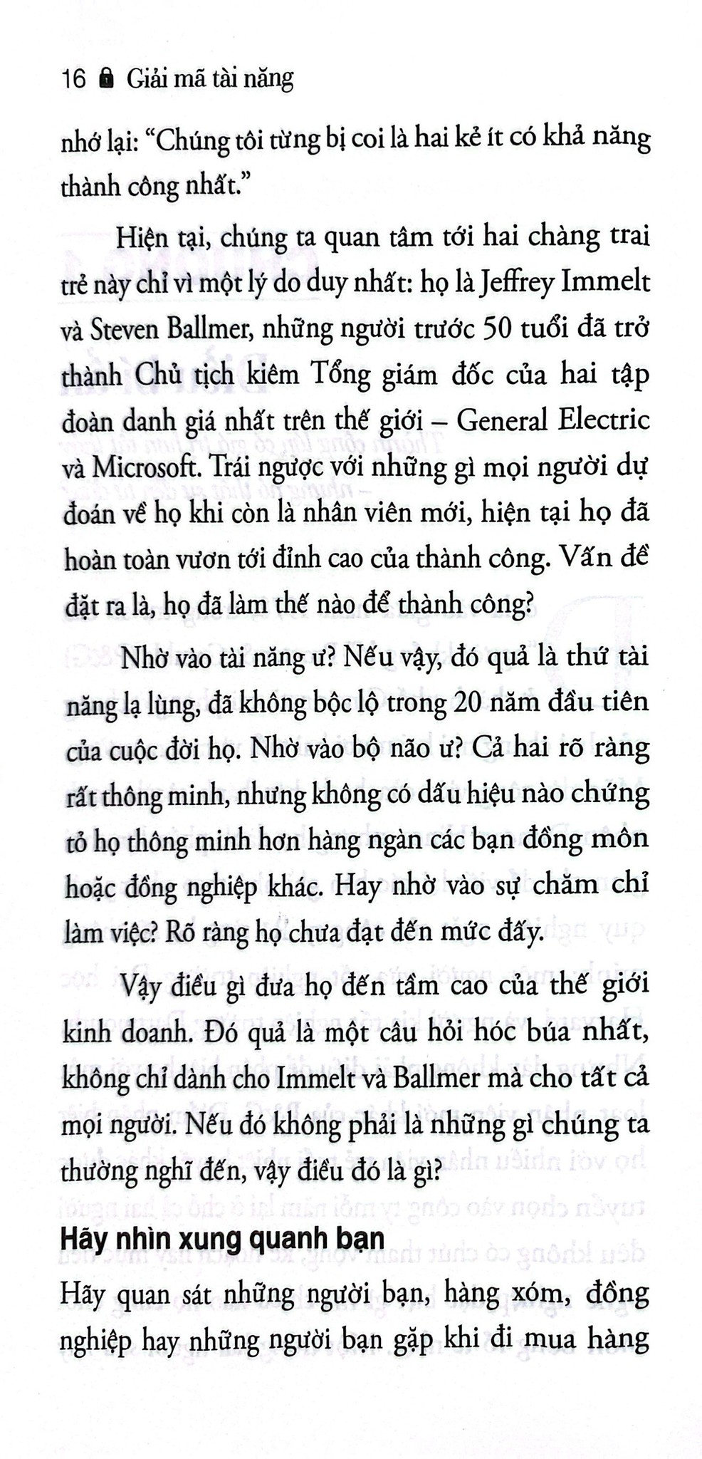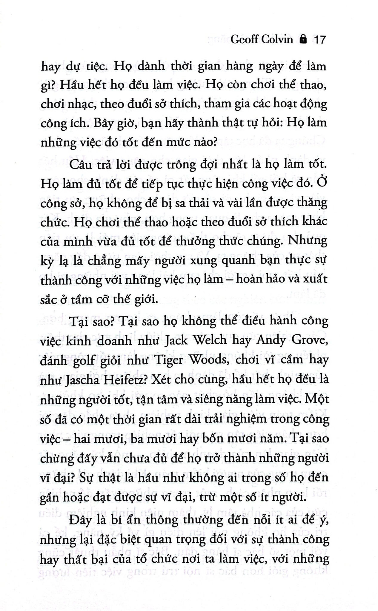Nhưng cuốn sách bạn đang cầm trong tay là kết quả nghiên cứu nghiêm túc của nhiều nhà khoa học uy tín. Và giờ đây ta có minh chứng cho lời của Thomas Edison bằng giấy trắng mực đen: “Thiên tài là 1% cảm hứng và 99% mồ hôi”. Geoff Colvin đã phũ phàng dọn sạch mọi lầm tưởng rằng năng khiếu trời cho là chìa khóa duy nhất dẫn đến thành tựu phi thường.