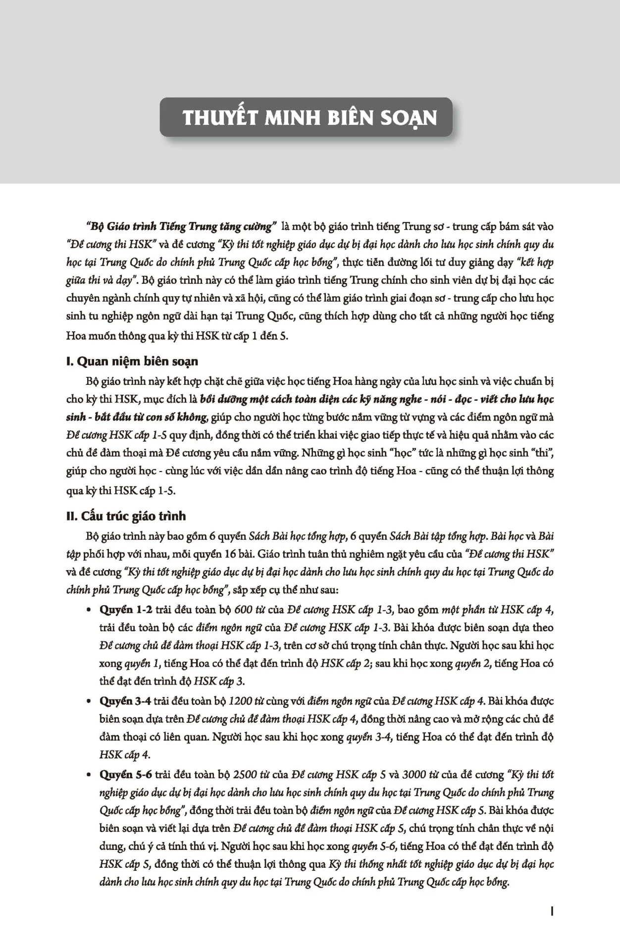 GIÁO TRÌNH TIẾNG TRUNG TĂNG CƯỜNG là bộ giáo trình chủ lực mới nhất hiện nay của trường Đại học Ngôn ngữ Bắc Kinh xuất bản năm 2021. Bộ giáo trình bám sát hai đề cương là “Đề cương thi HSK” và đề cương “Kỳ thi tốt nghiệp giáo dục dự bị đại học dành cho lưu học sinh chính quy du học tại Trung Quốc do Chính phủ Trung Quốc cấp học bổng”, với mục đích bồi dưỡng một cách toàn diện các kỹ năng nghe - nói - đọc - viết cho học viên bắt đầu từ đầu, theo nguyên tắc “HỌC ĐỂ THI”. Học viên học theo bộ giáo trình có thể thi HSK từ cấp 1 đến cấp 5.