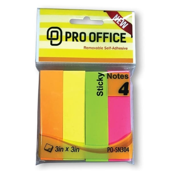 Giấy Note Pro Office 4 Màu Neon Vừa PO-SN304-3SN0006 là loại giấy viết lên được, mặt sau có lớp có keo nhẹ có thể dễ dàng dán lên và lấy đi trên mọi mặt phẳng: màn hình và vỏ máy tính, bàn làm việc, cặp tài liệu... dễ dàng bóc ra mà không để lại vết keo bẩn trên đó.