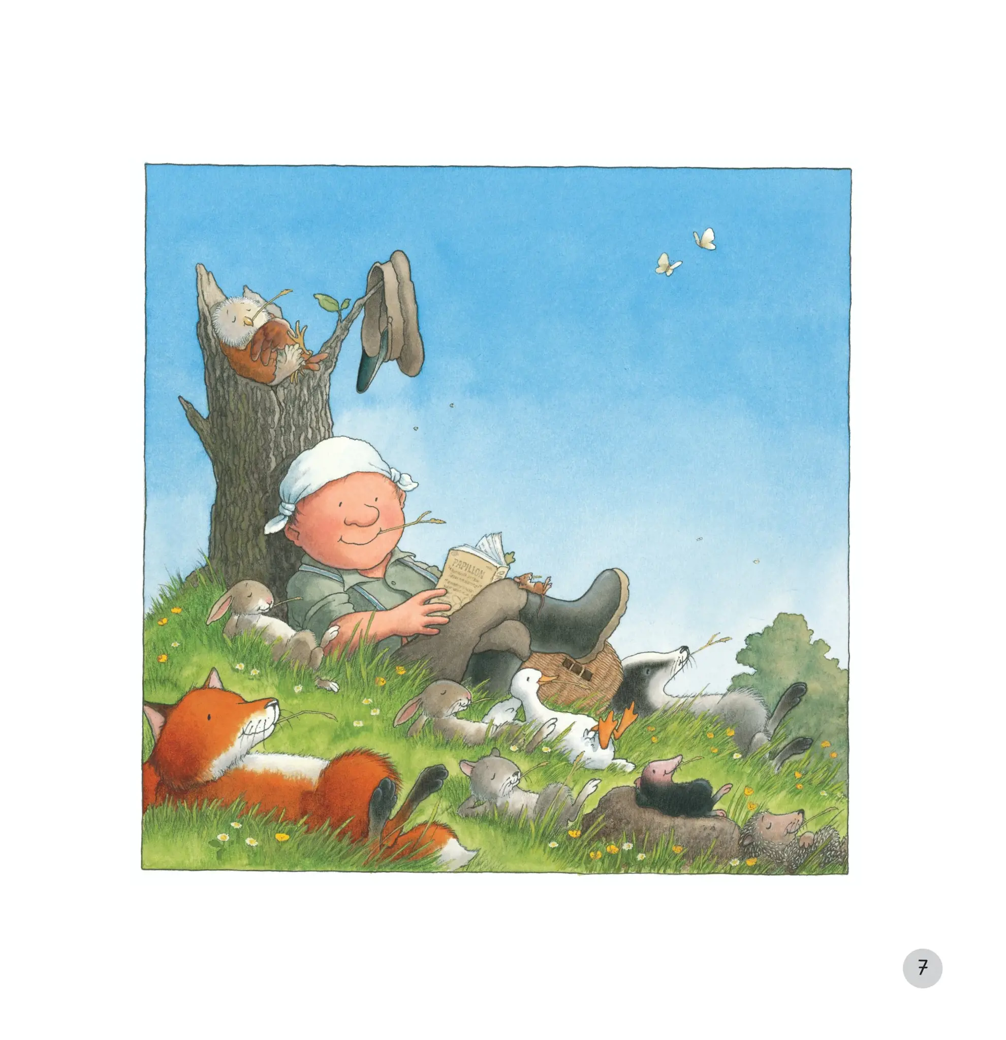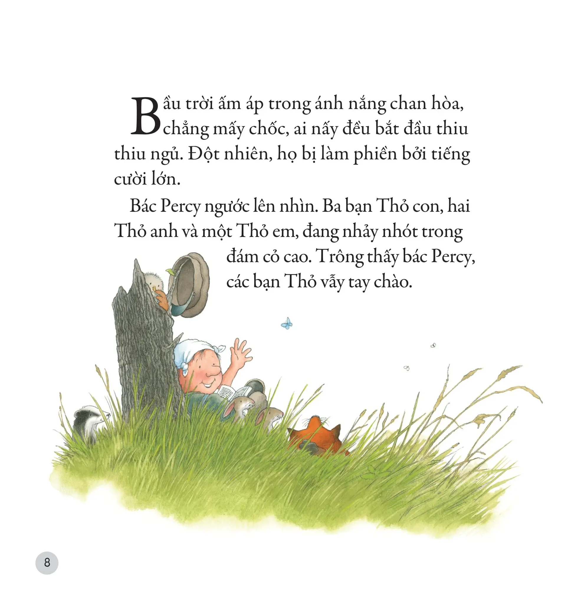 Bác ấy đã cởi chiếc mũ lưỡi trai ra và tự làm cho mình một chiếc mũ đi nắng bằng cách buộc túm các góc chiếc khăn tay lại. Sau đó, bác ấy dựa lưng vào một gốc cây già và mở sách ra đọc