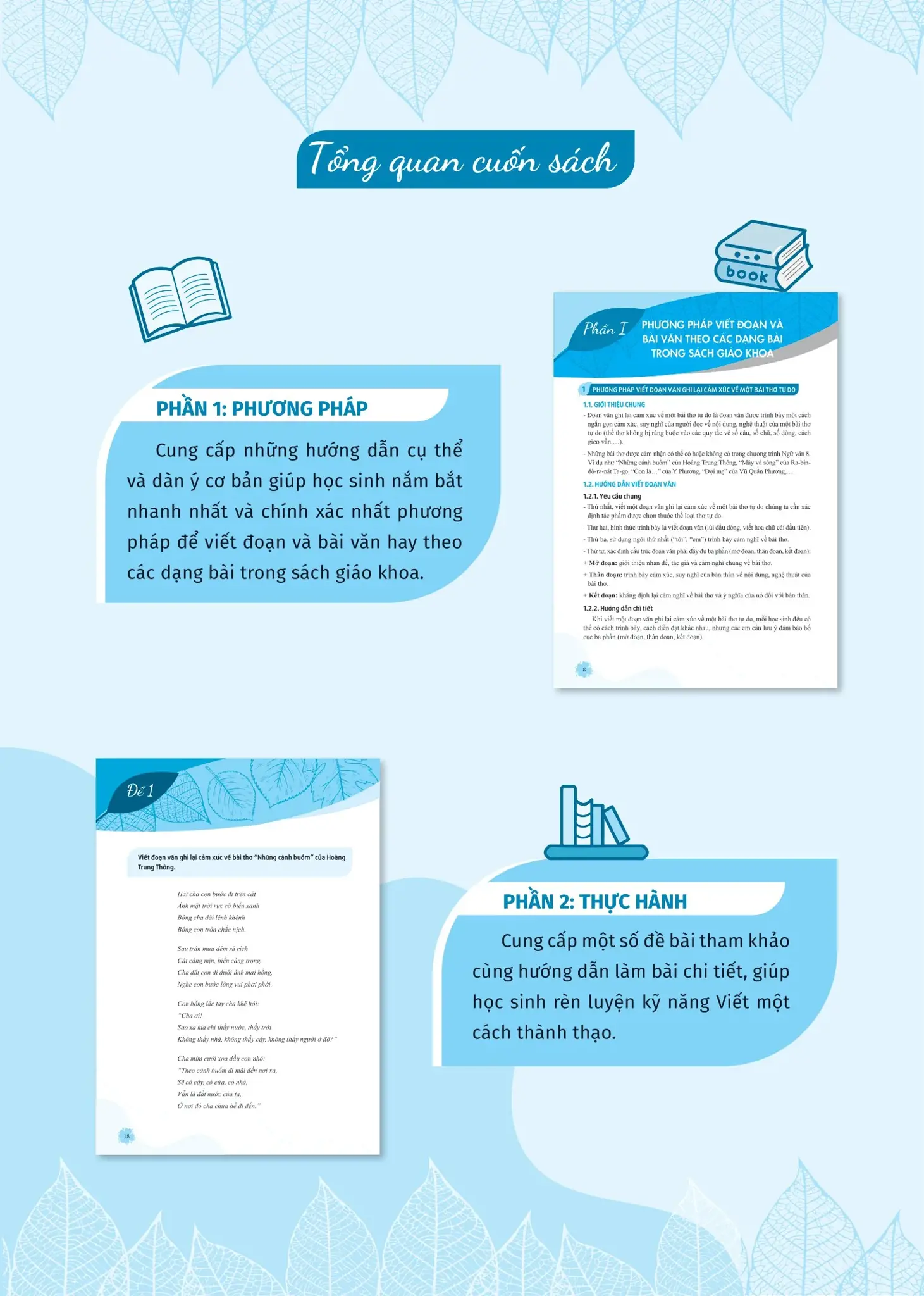 - Phương pháp viết đoạn và bài văn theo các dạng bài trong SGK: đưa ra những hướng dẫn tỉ mỉ, cụ thể cách viết đoạn văn ghi lại cảm xúc về một bài thơ lục bát/ bài thơ và viết bài văn theo từng thể loại cụ thể (thuyết minh, miêu tả, nghị luận, tự sự).