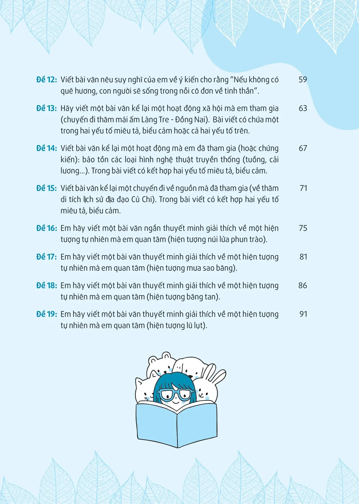 - Thực hành: gồm một số đề bài tham khảo gồm hướng dẫn làm bài, gợi ý nhan đề, gợi ý dàn bài và bài văn mẫu tham khảo nhằm hướng dẫn học sinh luyện kĩ năng Viết một cách thành thạo.