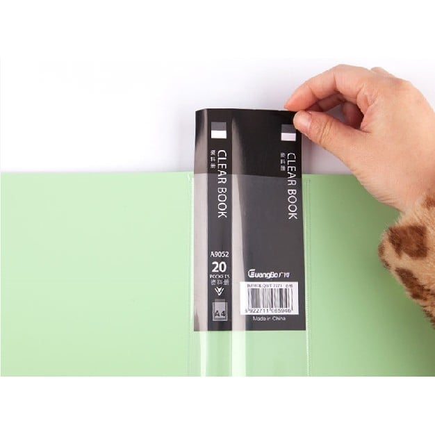 Sản phẩm Guangbo - Bìa File 20 Lá Màu A9052 là một dạng sổ/file lá đựng tài liệu khổ A4 với bìa ngoài cứng cáp và 20 lá nhựa trong suốt bên trong, giúp bảo quản và phân loại giấy tờ một cách hiệu quả.