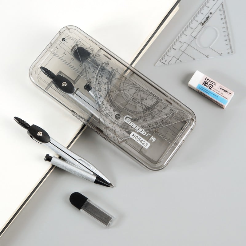 Bộ H05423 bao gồm đầy đủ các dụng cụ cần thiết cho môn toán hình học và các công việc đo đạc khác, được đóng gói gọn gàng trong một hộp đựng tiện lợi.