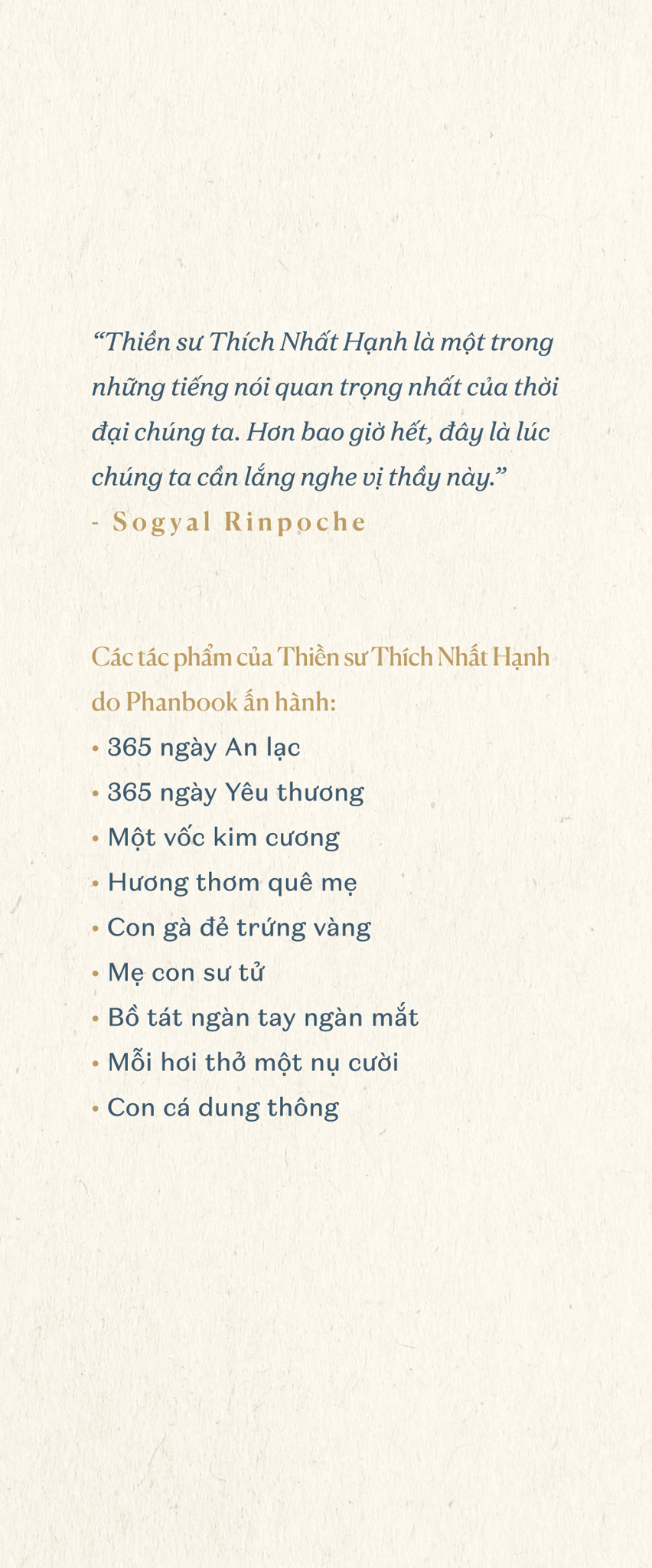 "Thiền sư Thích Nhất Hạnh là một trong những tiếng nói quan trọng nhất của thời đại chúng ta. Hơn bao giờ hết, đây là lúc chúng ta cần lắng nghe vị thầy này." – Sogyal Rinpoche
