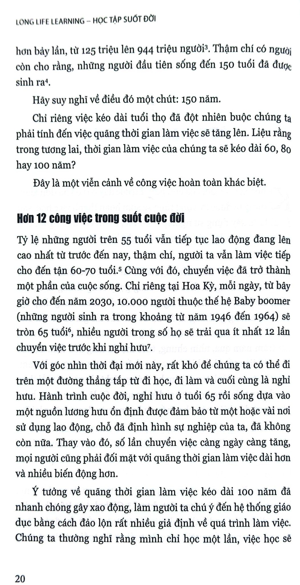 Bên cạnh đó, các nhà nghiên cứu dự đoán trong tương lai gần, tuổi thọ con người tăng lên, dẫn đến quãng thời gian làm việc kéo dài hơn, mỗi người trong chúng ta sẽ có 20 - 30 lần thay đổi công việc. Làm thế nào để đối mặt với quãng thời gian làm việc có thể lên đến 100 năm, làm sao để có thể tích lũy đủ kiến thức và kỹ năng để có thể thích ứng nhanh với nhu cầu công việc? Việc học tập của chúng ta trong tương lai chắc chắn sẽ diễn ra song hành với quá trình lao động.