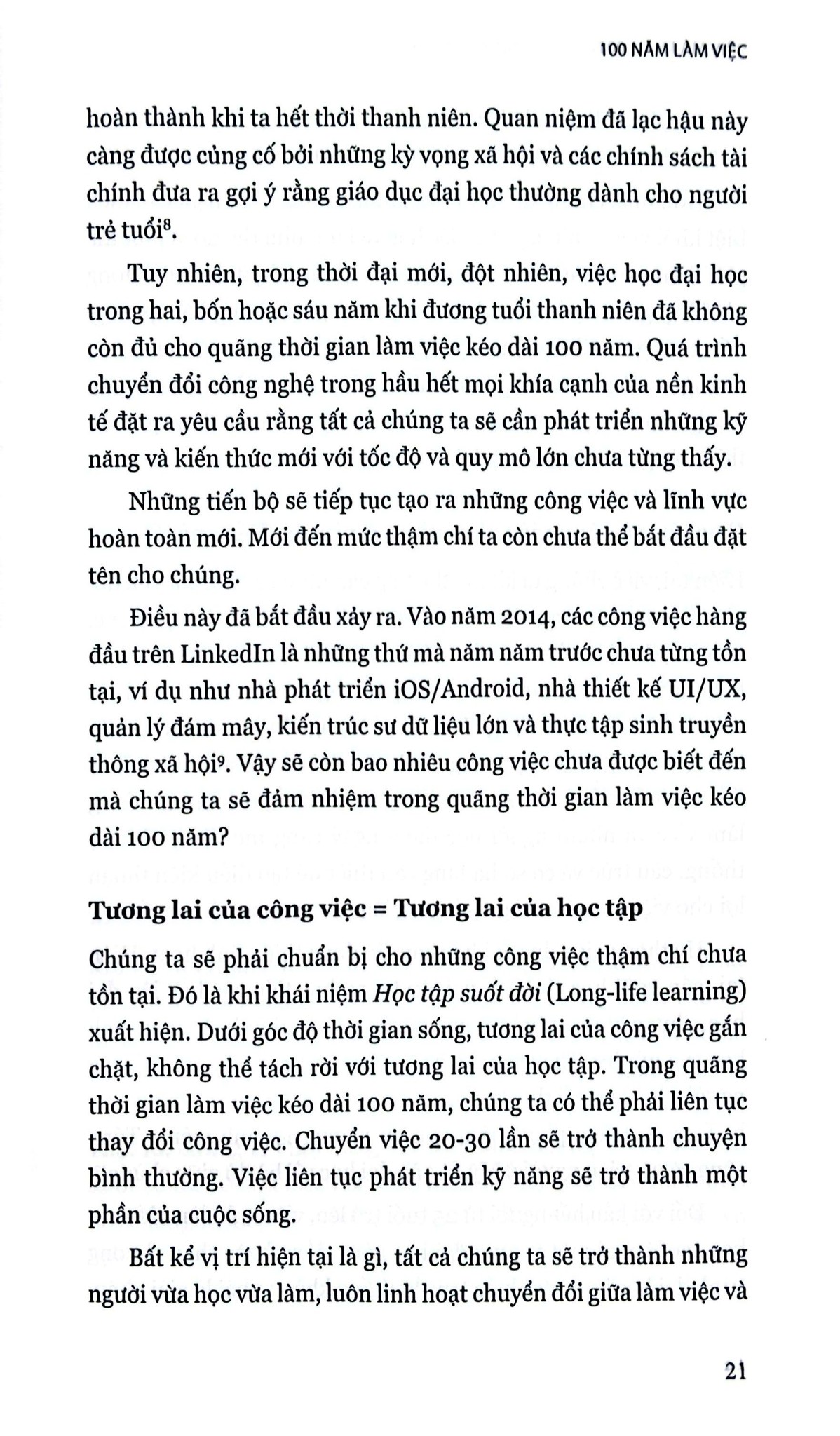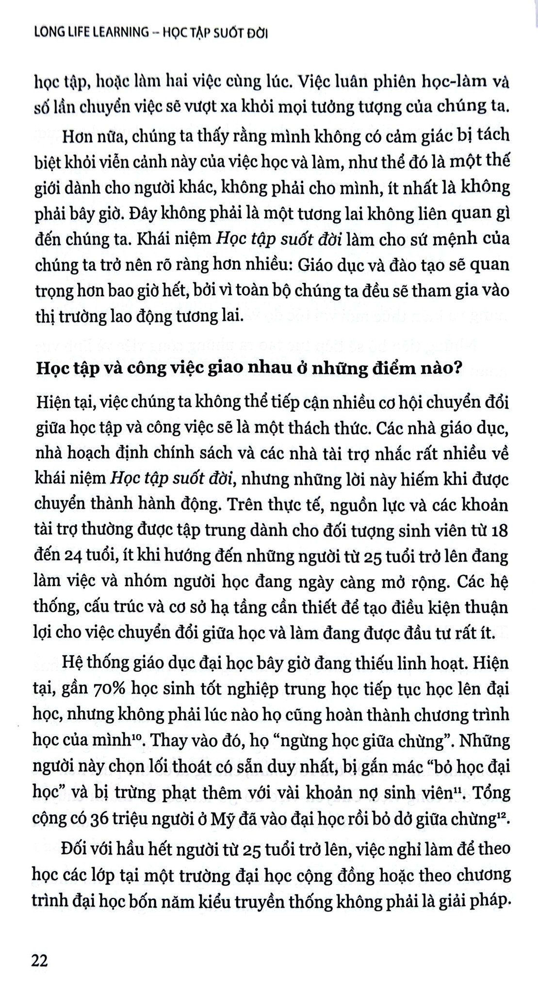 Để giúp độc giả chuẩn bị tốt để đối mặt với quãng thời gian làm việc nhiều hơn, số lần đổi việc cũng nhiều hơn, cuốn sách tập trung vào những đổi mới mang tính đột phá, nhằm đặt nền tảng cho một mô hình học tập mới phù hợp với những người vừa học vừa làm, có định hướng rõ ràng, hỗ trợ toàn diện, hữu ích và rõ ràng với cả người lao động, các nhà giáo dục và bên sử dụng lao động trước một tương lai đầy biến động.