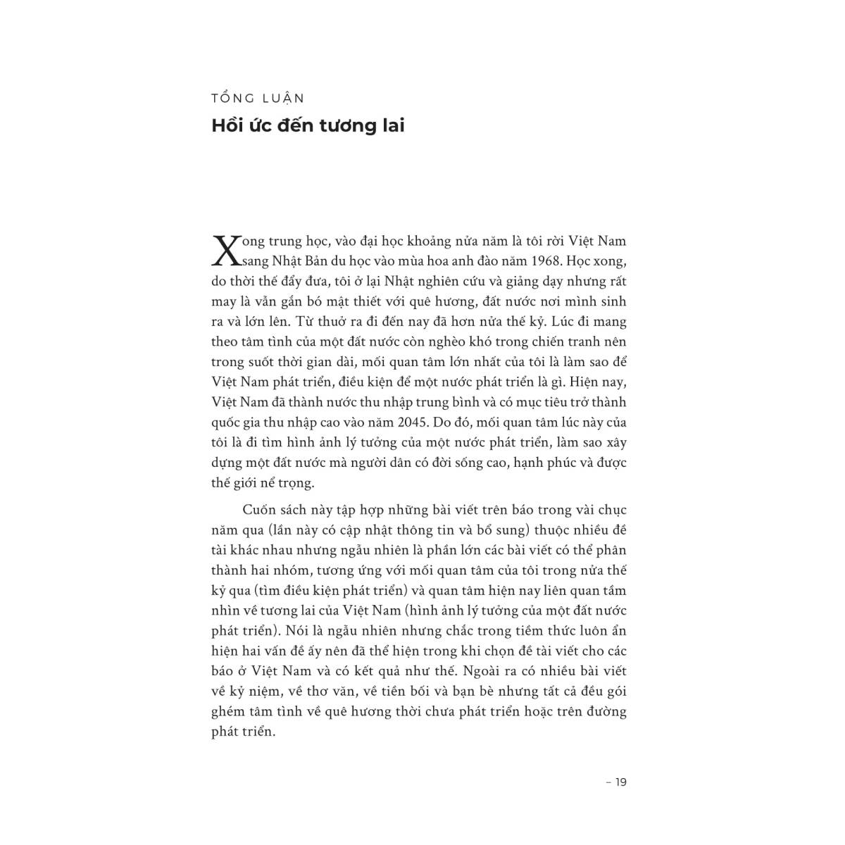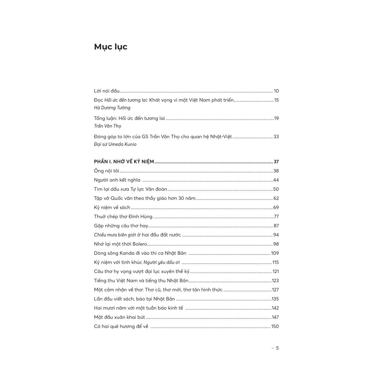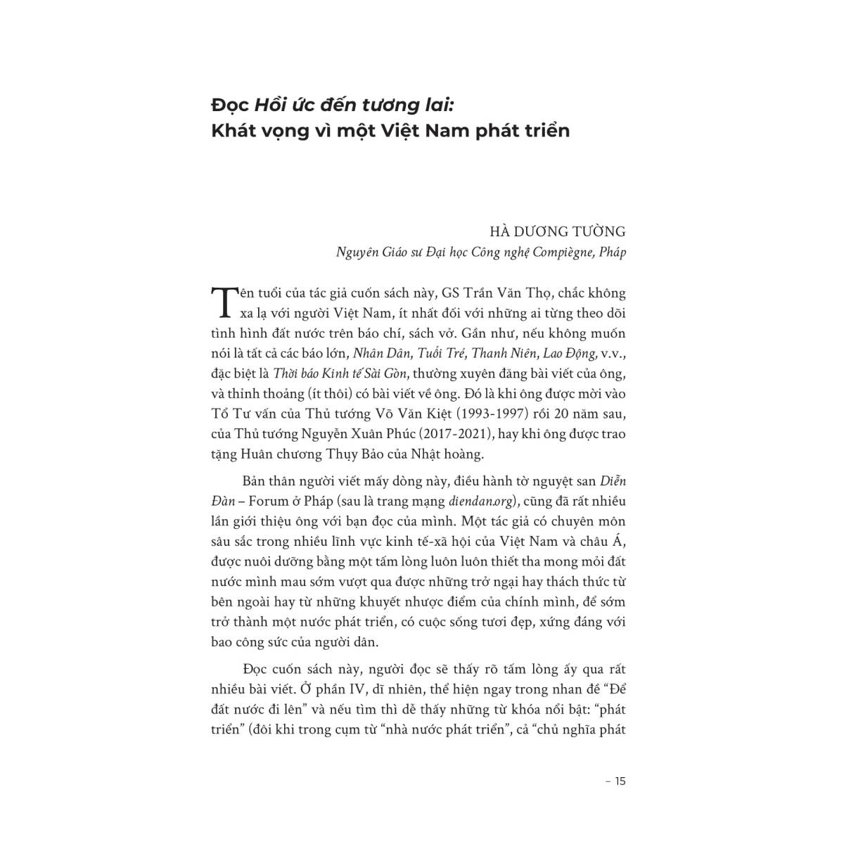 Cuốn sách “Hồi ức đến tương lai” của Giáo sư Trần Văn Thọ là một tập hợp những bài báo chính luận, ghi chép và tùy bút đầy trăn trở, giàu cảm xúc, được ông chắt lọc, cập nhật và bổ sung trong nhiều năm, phản ánh sâu sắc hai mối quan tâm xuyên suốt cuộc đời ông: 1. Làm thế nào để Việt Nam phát triển – từ một đất nước nghèo nàn và chiến tranh trở thành quốc gia có thu nhập cao; 2. Hình ảnh lý tưởng của một quốc gia phát triển – nơi người dân có đời sống hạnh phúc, văn minh và được thế giới kính trọng.